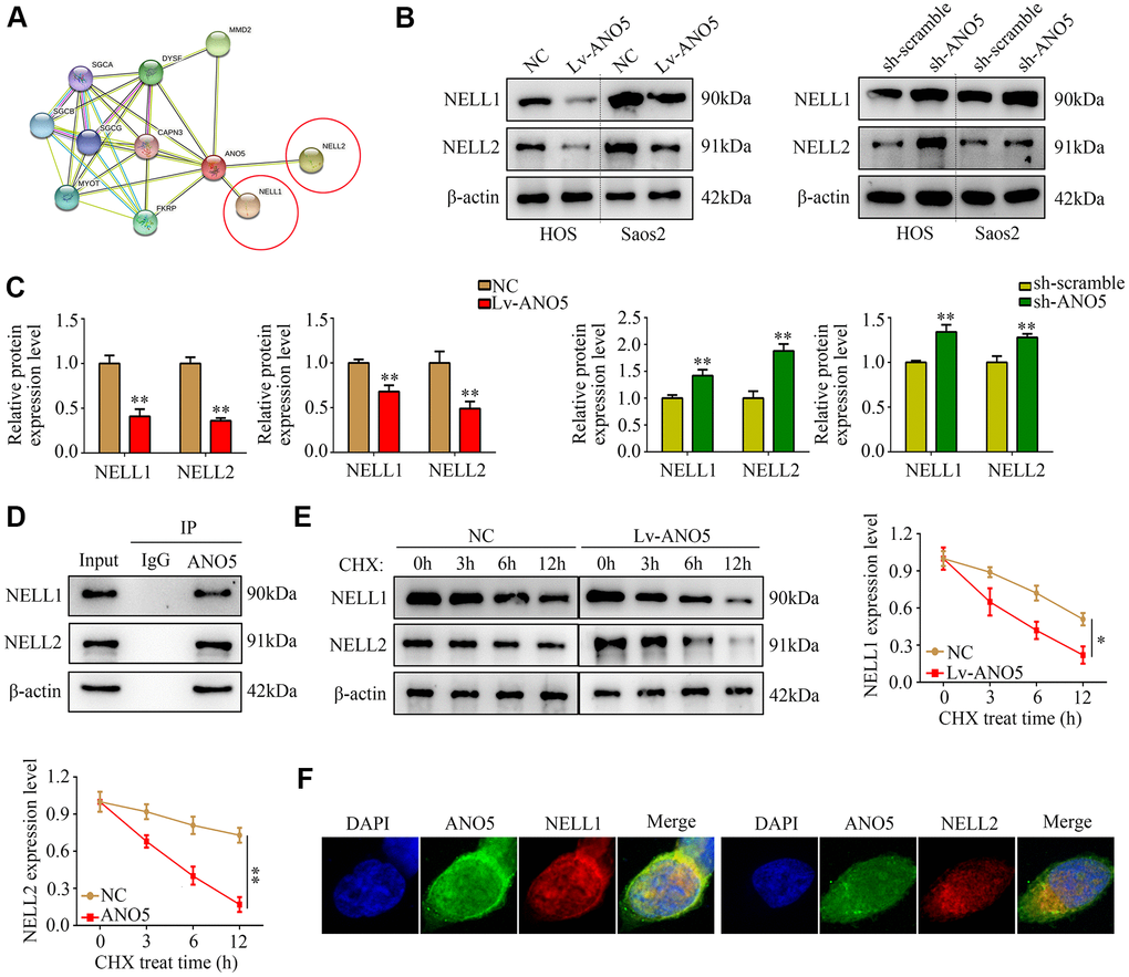 To explore how ANO5 promotes osteosarcoma development, the online tool STRING was used to identify proteins that interact with ANO5. NELL1 and NELL2, which act as suppressors in various types of cancer including osteosarcoma, were identified as proteins that interact with ANO5 (Figure 4A). We found that NELL1 and NELL2 protein levels were decreased in ANO5 overexpression cells and were increased in ANO5 knockdown cells (Figure 4B, 4C). In addition, immunoprecipitation demonstrated that ANO5 directly interacted with NELL1 and NELL2 (Figure 4D). Moreover, a cycloheximide (CHX, 10 μM) was used and the result indicated that overexpression of ANO5 increased the degradation rates of NELL1 and NELL2 (Figure 4E). Furthermore, confocal microscopy demonstrated that ANO5 was colocalized with NELL1 and NELL2 in osteosarcoma cells (Figure 4F).