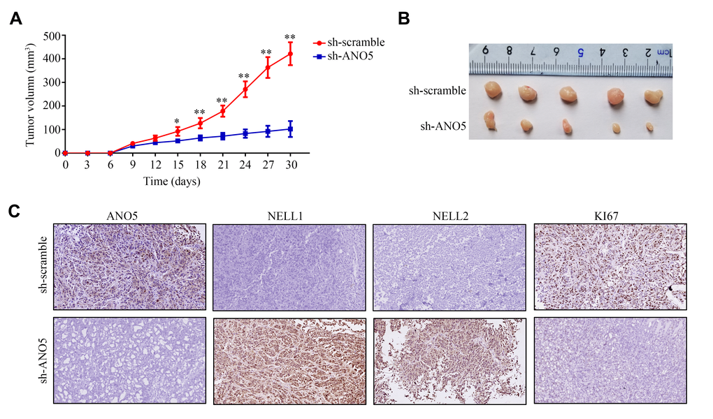 A subcutaneous tumor transplantation model was then employed to examine the effects of ANO5 on osteosarcoma cell proliferation and NELL1 and NELL2 expression in vivo. The results showed that inhibition of ANO5 markedly reduced osteosarcoma cell proliferation rates in vivo (Figure 5A, 5B). Furthermore, both NELL1 and NELL2 were increased in tumor tissues with lower ANO5 expression, while the expression of KI67 (a biomarker for proliferation) was decreased (Figure 5C). Taken together, these findings demonstrate that suppression of ANO5 decreased osteosarcoma cell proliferation and increased NELL1 and NELL2 expression in vivo.