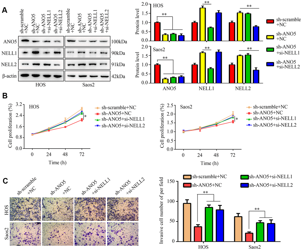 Inhibition of NELL1 or NELL2 reversed the inhibitory effects of ANO5 knockdown in osteosarcoma cells