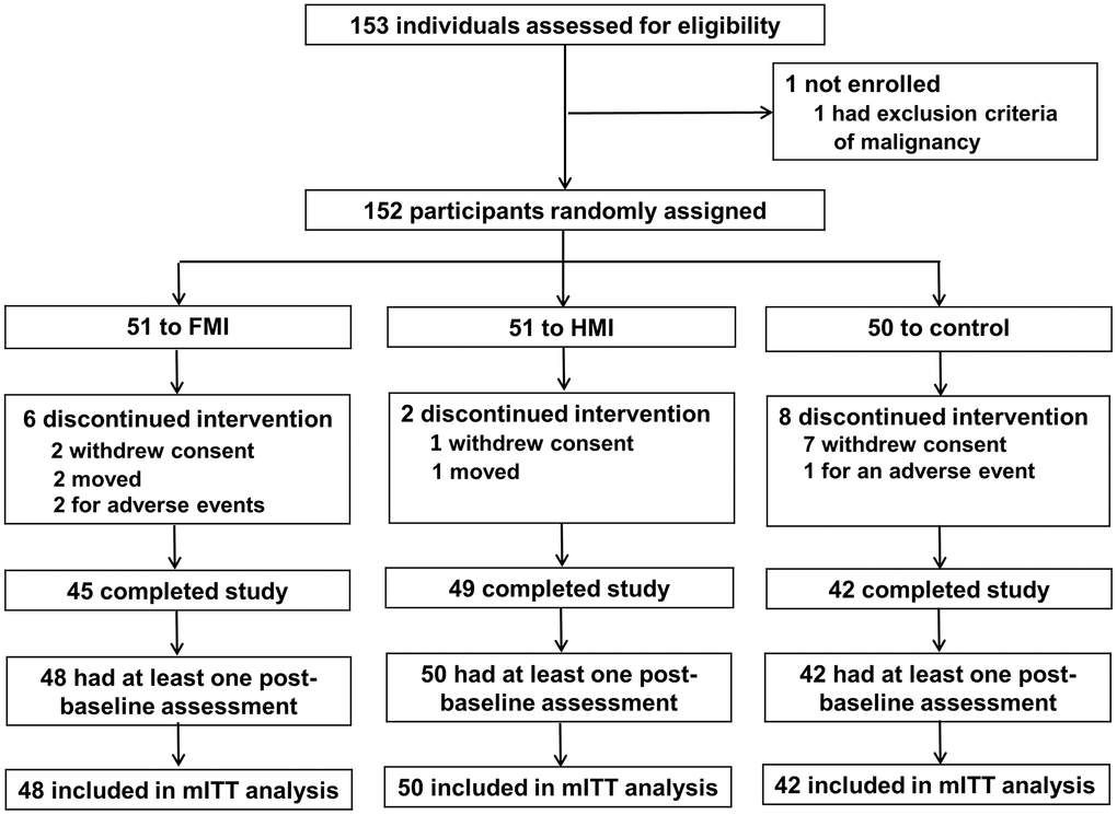 Between May 29 and August 20, 2019, 152 participants were randomly assigned to three groups: 51 to the FMI group, 51 to the HMI group, and 50 to the control group (Figure 1). The study ended in February 2020. Finally, 45, 49, and 42 participants completed the study in the FMI, HMI, and control groups, respectively. The retention rates at week 24 were 88.2%, 96.1%, and 84.0% in the FMI, HMI, and control groups, respectively. Differences in the retention rates of the groups were not significant (P = 0.13). The modified intention-to-treat (mITT) analysis participants were 48, 50, and 42 in the FMI, HMI, and control groups, respectively.