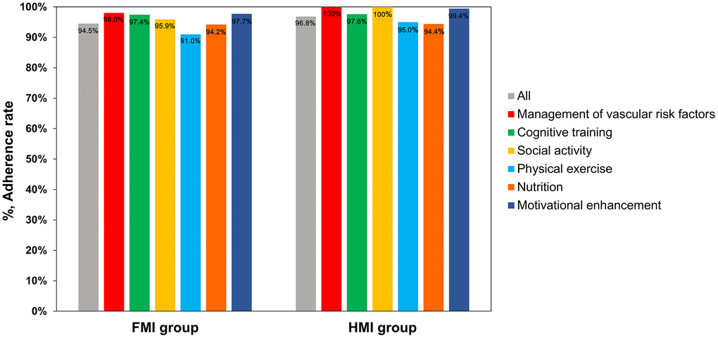 The total adherence rates were 94.5% (95% confidence interval [CI], 91.4-97.6%) in the FMI group and 96.8% (95% CI, 95.4-98.1%) in the HMI group. The adherence rates to the vascular and metabolic risk factor management program, cognitive training program using a tablet-based application or workbooks, social activity program, physical exercise program, nutritional program, and motivational enhancement program were 98.0%, 97.4%, 95.9%, 91.0%, 94.2%, and 97.7% in the FMI group, and 100%, 97.6%, 100%, 95.0%, 94.4%, and 99.4% in the HMI group (Figure 2).