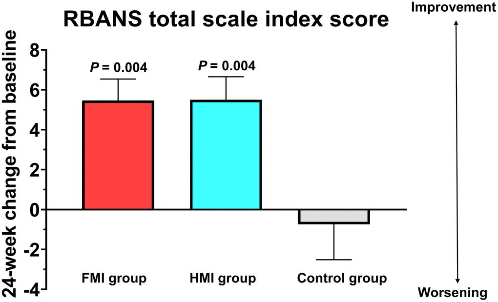 No significant differences were observed between the FMI group and the HMI group in retention rate, adherence rate, and changes in the RBANS total scale index score and secondary outcomes.