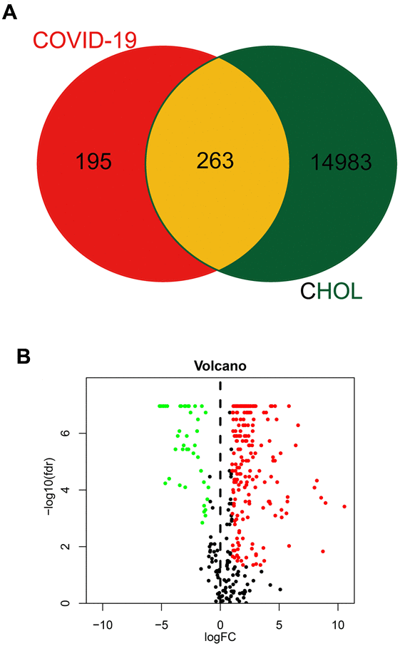 Using the network pharmacology approach, we identified 458 genes associated with COVID-19 (Figure 1A). Meanwhile, 15,246 common differential expressed genes in CHOL patients were obtained from the TCGA database (Figure 1A). When we compared these two gene clusters, we found 263 overlapping genes between COVID-19 and CHOL patients (Figure 1A), in which, 221 genes were up-regulated and 42 genes were down-regulated in CHOL patients (Figure 1B).