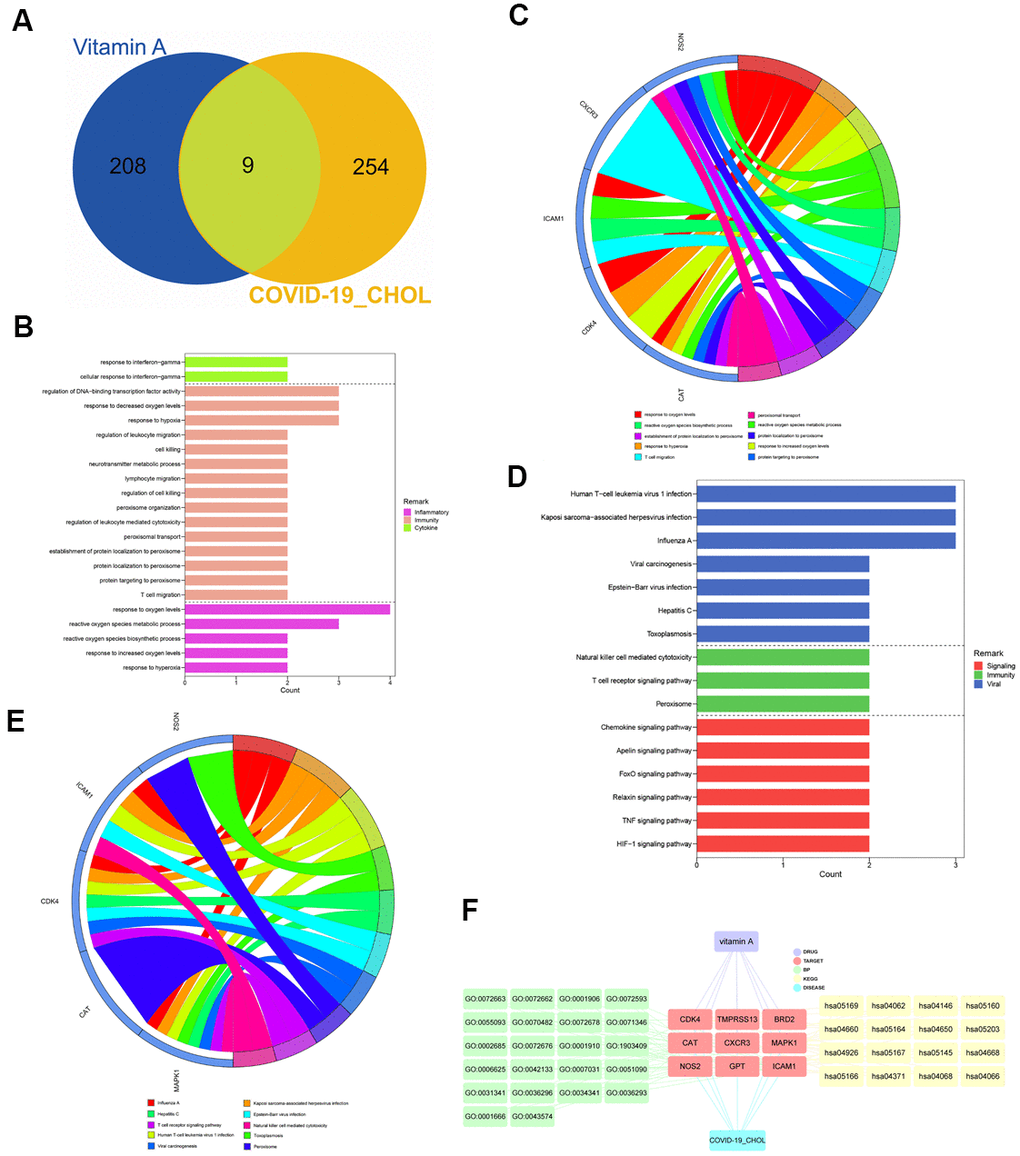 217 VA-related targets were obtained from the UniProt database. When we compared the CHOL/COVID-19-associated genes with VA-targeted genes, we identified 9 overlapping genes (Figure 3A and Supplementary Table 1). These 9 intersection genes were submitted to GO and KEGG enrichment analyses, the results showed that VA affected several biological processes related to oxygen level such as response to hypoxia, response to hyperoxia, and metabolic/biosynthetic process of reactive oxygen species. Also, our results highlighted T cell migration, peroxisomal protein targeting, protein localization to peroxisome, establishment of protein localization to peroxisome, peroxisomal transport, regulation of leukocyte-mediated cytotoxicity, peroxisome organization, regulation of DNA-binding transcription factor activity, regulation of cell killing, lymphocyte migration, neurotransmitter metabolic process, cell killing, regulation of leukocyte migration, and cellular response to interferon-gamma (Figure 3B, 3C and Supplementary Table 2). In the KEGG pathway analysis, 35 pathways related to Influenza A, Kaposi sarcoma-associated herpesvirus infection, human T-cell leukemia virus 1 infection, toxoplasmosis, hepatitis C, Epstein-Barr virus infection, viral carcinogenesis, peroxisome, T cell receptor signaling pathway, natural killer cell-mediated cytotoxicity, hypoxia-inducible factor-1 signaling pathway, tumor necrosis factor (TNF) signaling pathway, relaxin signaling pathway, FOXO signaling pathway, apelin signaling pathway, and chemokine signaling pathway were identified (Figure 3D, 3E and Supplementary Table 3). As a result, the network visualization of VA/CHOL/COVID-19 mediated biological processes and KEGG pathways was plotted using Cytoscape 3.7.1, as shown in Figure 3F.