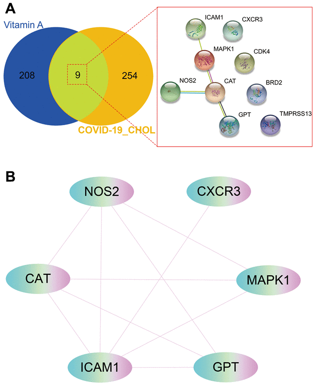 The 9 intersection targets of VA against CHOL/COVID-19 were subjected to STRING analysis to understand the protein-protein interaction (Figure 4A). Furthermore, six core gene targets including CAT, NOS2, CXCR3, MAPK1, GPT, and ICAM1 of VA against CHOL/COVID-19 were identified using Cytoscape tool (Figure 4B).
