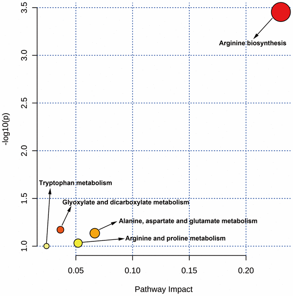 Using the MetaboAnalyst tool, it was observed that the metabolic pathways of VA against CHOL/COVID-19 were involved in arginine biosynthesis; glyoxylate and dicarboxylate metabolism; alanine, aspartate, and glutamate metabolism; arginine and proline metabolism, and tryptophan metabolism (Figure 5).
