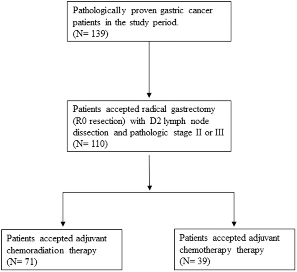 We enrolled patients with gastric cancer who had undergone D2 dissection with removal of at least 15 lymph nodes and fulfilled adjuvant treatment at a medical center in Taiwan between January 2009 and January 2013. Patients were recruited into this study according to the following criteria: 20 years of age or older at diagnosis; Eastern Cooperative Oncology Group (ECOG) performance status of 1 or less; and histologically proven gastric adenocarcinoma, stage II or III, according to the sixth edition TNM staging criteria of the American Joint Commission on Cancer (AICC) [10]. However, patients with any evidence of macroscopic or microscopic residual tumors after surgery were excluded.