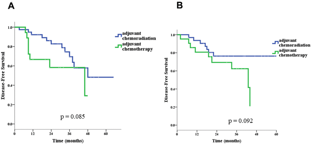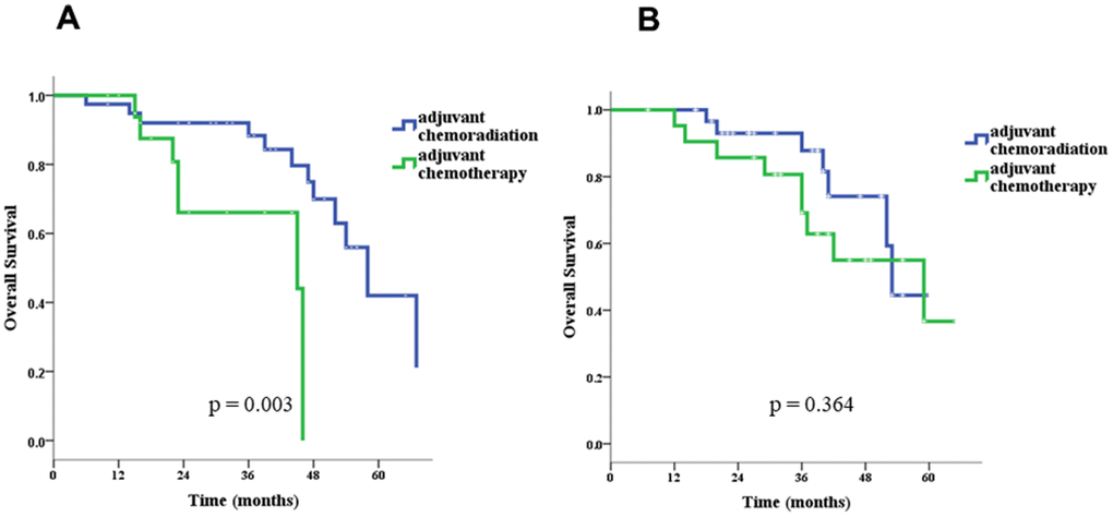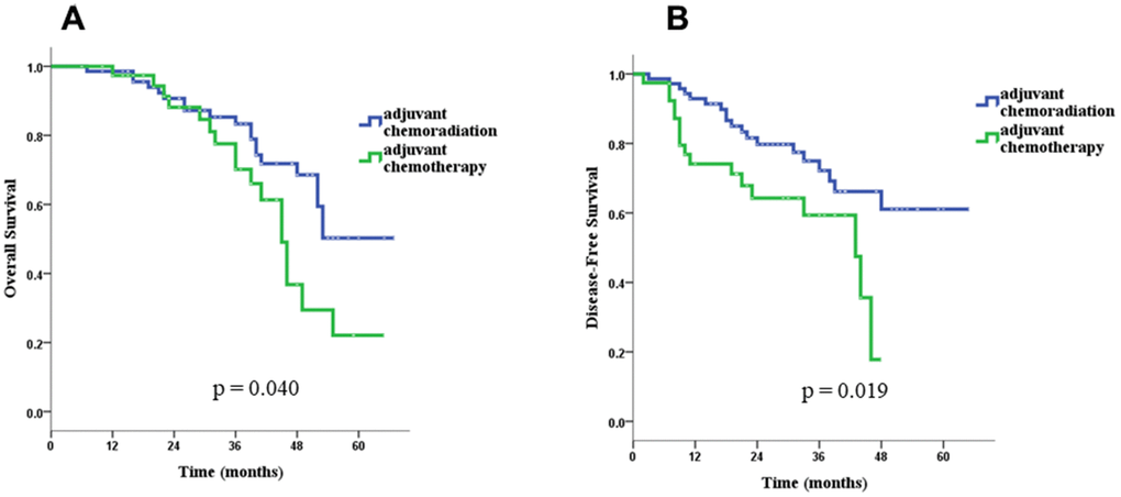 Our study has some limitations. First of all, it was not a randomized trial, and thus was more likely to be affected by confounding factors. However, we evaluated the major potential confounders and adjusted for those that have been identified as likely to affect our results in the multivariate analyses. Secondly, the present study had a relatively small sample size, which limited the statistical power. Nonetheless, it provided enough power to detect some of the differences between patients with and without adjuvant CCRT such as those in the major side effects. It also provided enough power to identify age and pN stage as independent predictors for OS and pT stage as an independent predictor for DSF. More importantly, it even provided enough power to identify the effect modification of age on the benefit of CCRT. The current study was also limited by the follow up period, which was relatively short, not reaching five years in many cases. Therefore, studies with longer follow up periods are needed to confirm the findings.