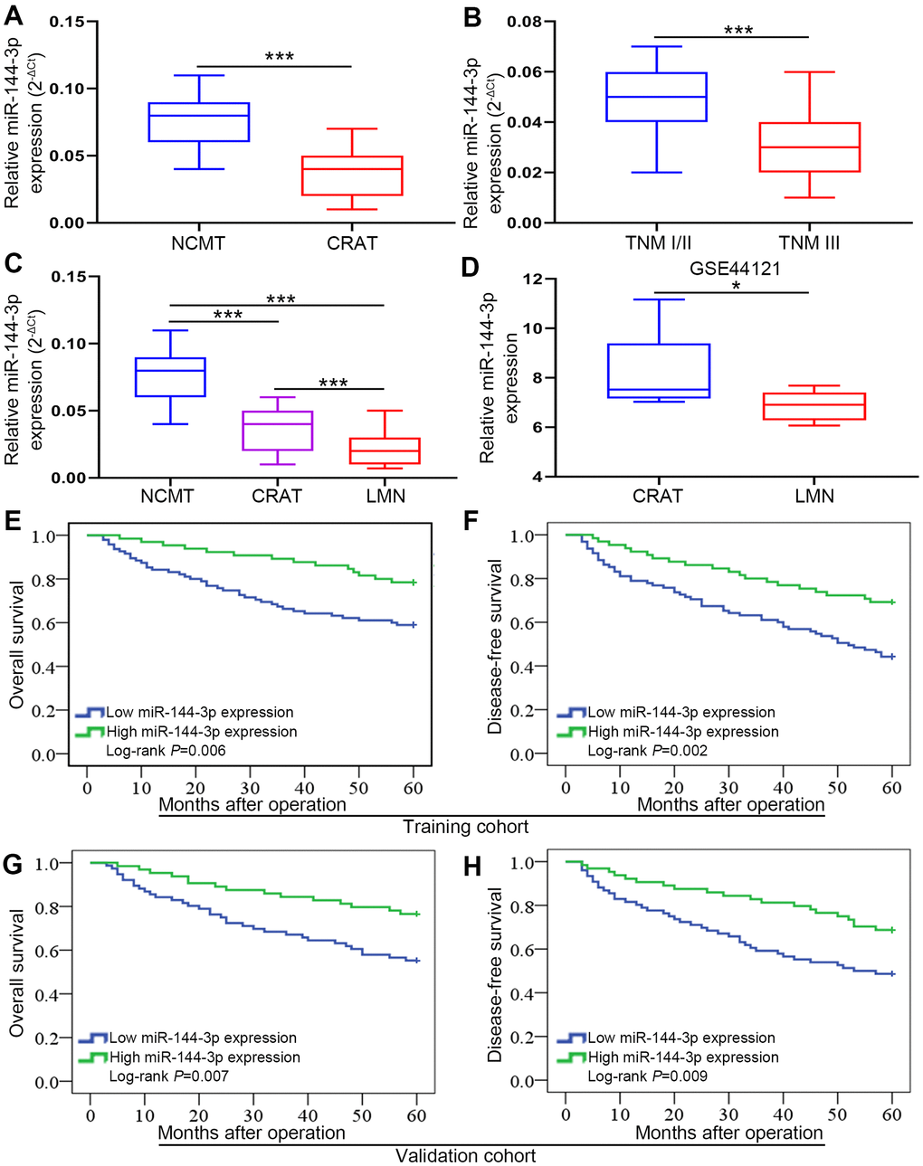 The analysis of 160 pairs of fresh frozen CRATs and corresponding NCMTs from training cohort showed that miR-144-3p level was lower in CRATs than in NCMTs (Figure 1A). Furthermore, miR-144-3p level was lower in CRATs with TNM stage III than in those with TNM stage I/II (Figure 1B). Moreover, analysis of 8 matched NCMTs, CRATs and LMNs demonstrated that miR-144-3p level gradually decreased from NCMTs, CRATs to LMNs (Figure 1C). Analysis of miR-144-3p level in CRATs and LMNs from the GEO dataset (GSE44121) showed that miR-144-3p level was lower in LMNs than in CRATs (Figure 1D).