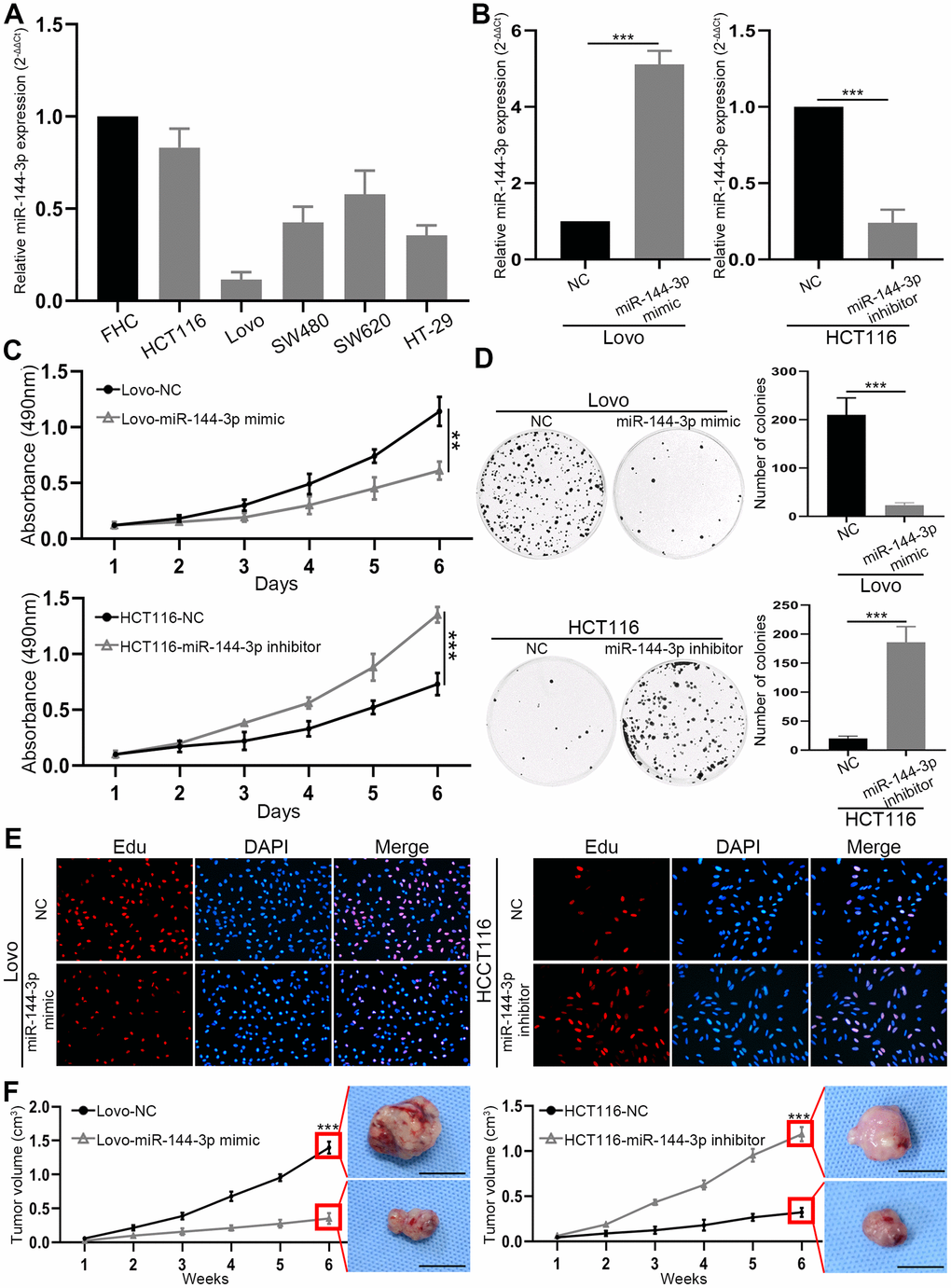MTT assay showed that miR-144-3p mimic inhibited Lovo cell proliferation, while miR-144-3p inhibitor significantly promoted HCT116 cell proliferation (Figure 2C). Moreover, miR-144-3p mimic significantly inhibited colony formation of Lovo cells, while miR-144-3p inhibitor significantly enhanced colony formation of HCT116 cells (Figure 2D). Edu assay showed that miR-144-3p mimic reduced Lovo cell proliferation and miR-144-3p inhibitor increased HCT116 cell proliferation (Figure 2E). By using subcutaneous xenograft tumor model, we found that tumors derived from Lovo cells treated with miR-144-3p mimic were significantly smaller (Figure 2F). In contrast, miR-144-3p inhibitor promoted the growth of tumors derived from HCT116 cells (Figure 2F).