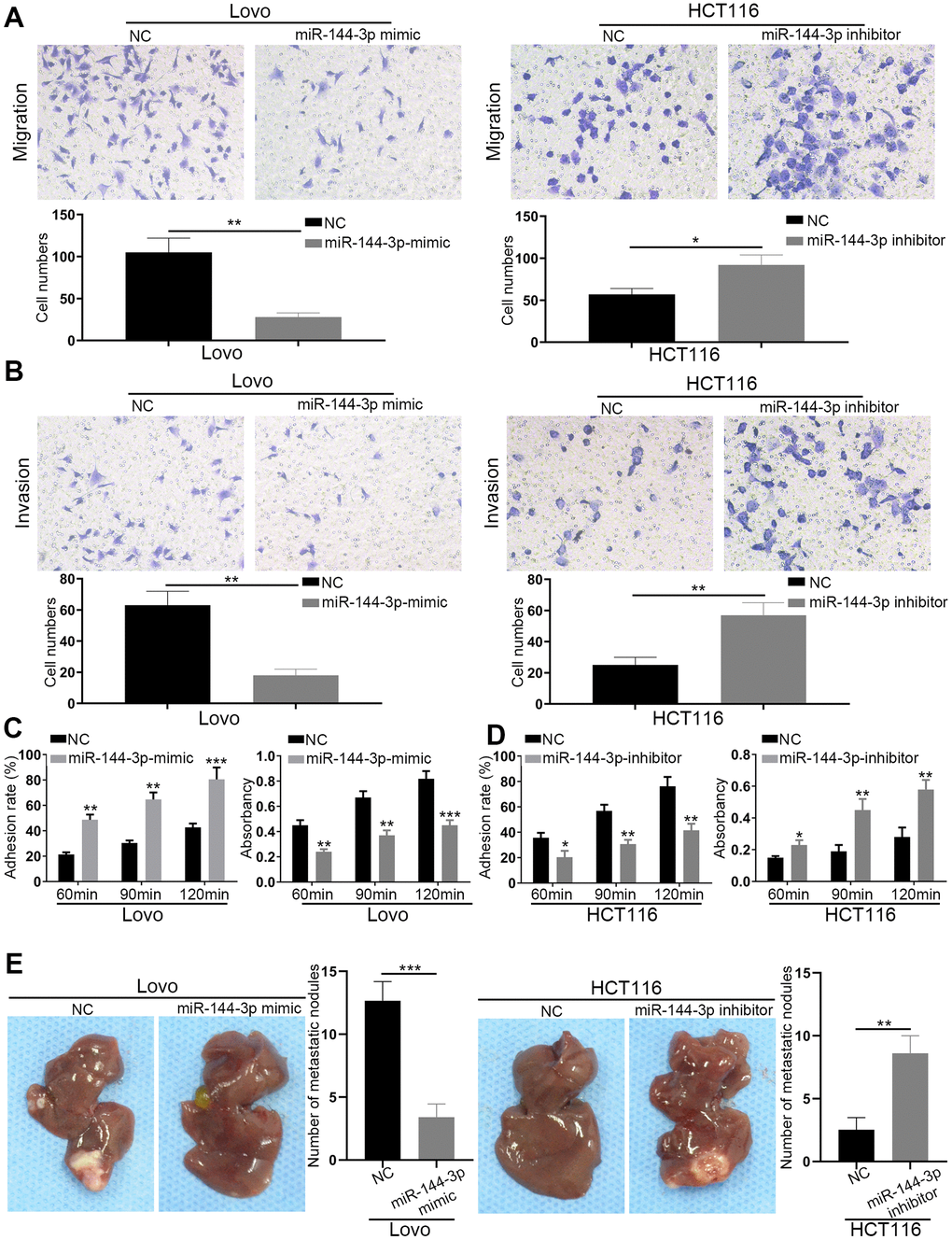 Transwell migration assays showed that miR-144-3p mimic significantly inhibited Lovo cell migration, while miR-144-3p downregulation in HCT116 significantly increased cell migration (Figure 3A). Transwell invasion assays showed similar results (Figure 3B). Adhesion assays showed that miR-144-3p mimic significantly enhanced cell-cell adhesion but decreased cell-ECM adhesion in Lovo cells. However, miR-144-3p inhibitor significantly decreased cell-cell adhesion but increased cell-ECM adhesion in HCT116 cells (Figure 3C, 3D). Furthermore, we found lower number of liver metastatic nodules from mice with the injection of Lovo cells transfected with miR-144-3p mimic and higher number of liver metastatic nodules from mice with the injection of HCT116 cells transfected with miR-144-3p inhibitor, compared to control mice (Figure 3E).