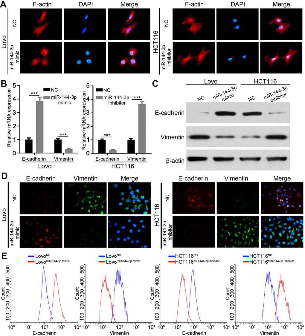 Next, we wondered whether miR-144-3p inhibited CRA metastasis by suppressing EMT. We detected actin cytoskeleton of CRA cells based on F-actin staining, because actin transformation is involved in cell adhesion and migration and EMT [24, 25]. Compared to control cells, Lovo cells treated with miR-144-3p mimic showed a cobblestone shape and shrunk F-actin fiber (Figure 4A). In contrast, HCT116 cells treated with miR-144-3p inhibitor presented elongated shape and long F-actin fibers (Figure 4A). Moreover, miR-144-3p mimic promoted E-cadherin expression but inhibited vimentin expression. Inversely, miR-144-3p inhibitor inhibited E-cadherin expression while enhanced vimentin expression (Figure 4B, 4C). Immunofluorescence staining for vimentin and E-cadherin showed similar results (Figure 4D). Flow cytometry showed higher E-cadherin expression and lower vimentin expression in Lovo cells treated with miR-144-3p mimic, while opposite results were shown in HCT116 cells treated with miR-144-3p inhibitor (Figure 4E).