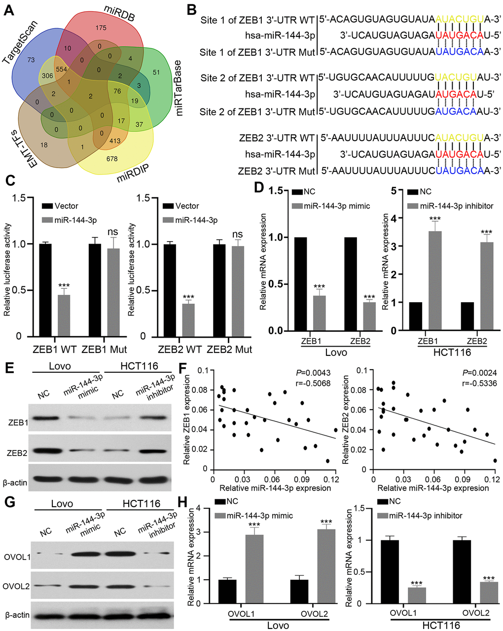 ZEB forms a mutually inhibitory feedback loop with transcription factors OVOL1/2 [32]. Therefore, we examined the expression of transcription factors OVOL1/2. While miR-144-3p mimic induced the expression of OVOL1/2 in Lovo cells, miR-144-3p inhibitor suppressed OVOL1/2 expression in HCT116 cells (Figure 5G, 5H).