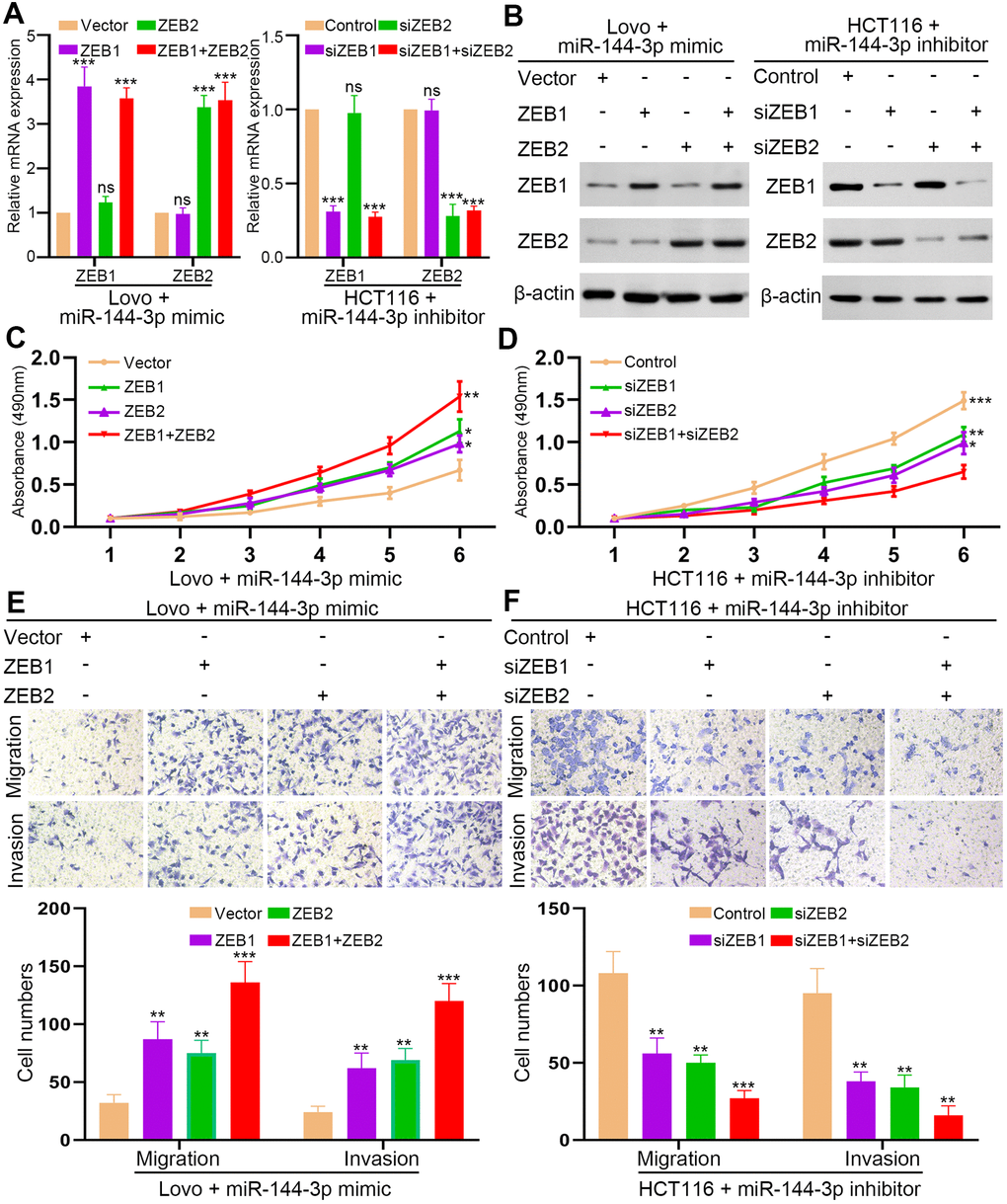 Next, we upregulated ZEB1/2 expression in LovomiR-144-3p mimic cells and downregulated ZEB1/2 expression in HCT116miR-144-3p inhibitor cells (Figure 6A, 6B). MTT assay showed that restoration of ZEB1 or ZEB2 could partly recover the proliferation of LovomiR-144-3p mimic cells (Figure 6C). However, when both ZEB1 and ZEB2 were elevated, the proliferation of LovomiR-144-3p mimic cells was completely restored (Figure 6C). In HCT116miR-144-3p inhibitor cells, knockdown of ZEB1 or ZEB2 could partly inhibit enhanced proliferation, which could be fully suppressed by knockdown of both ZEB1 and ZEB2 (Figure 6D). Similarly, the restoration of ZEB1 or ZEB2 alone could partly recover the migration and invasion of LovomiR-144-3p mimic cells (Figure 6E). The migration and invasion of LovomiR-144-3p mimic cells were completely restored after the overexpression of both ZEB1 and ZEB2 (Figure 6E). In HCT116miR-144-3p inhibitor cells, knockdown of ZEB1 or ZEB2 could partly inhibit enhanced migration and invasion (Figure 6F), whereas knockdown of both ZEB1 and ZEB2 completely suppressed cell migration and invasion (Figure 6F).