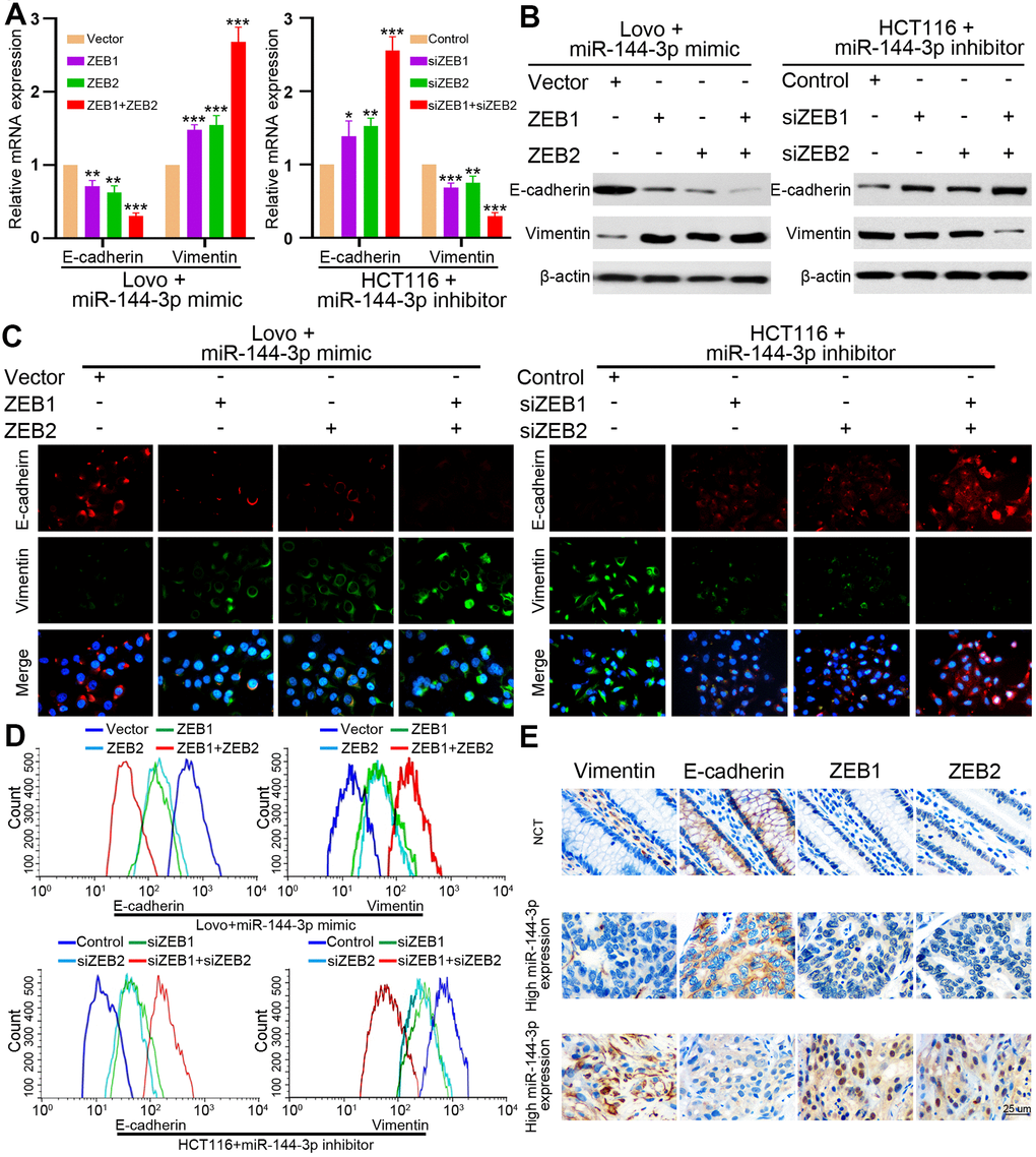 Finally, we examined whether miR-144-3p may inhibit EMT of CRA cells by targeting ZEB1 and ZEB2. In LovomiR-144-3p mimic cells, the upregulation of ZEB1 or ZEB2 alone could partly upregulate vimentin expression and partly inhibit E-cadherin expression (Figure 7A, 7B). When both ZEB1 and ZEB2 were upregulated, vimentin expression increased while E-cadherin expression decreased significantly (Figure 7A, 7B). In HCT116miR-144-3p inhibitor, knockdown of ZEB1 or ZEB2 alone could partly downregulate vimentin expression and upregulate E-cadherin expression, but the effects were better after knockdown of both ZEB1 and ZEB2 (Figure 7A, 7B). Immunofluorescence and flow cytometry confirmed that ZEB1 and ZEB2 mediated the effect of miR-144-3p on EMT in CRA cells (Figure 7C, 7D).
