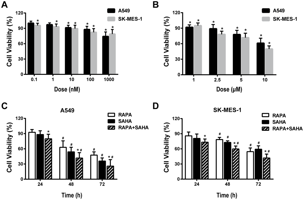 The viability of cultured A549 and SK-MES-1 cells was measured by CCK8 assay after 24 hours of exposure to RAPA or SAHA at different concentrations. RAPA and SAHA suppressed NSCLC cell proliferation in concentration-dependent manners (Figure 1A, 1B). The viability of NSCLC cells exposure to 100nM of RAPA or 2.5μM of SAHA alone or in combination was observed at various time points. RAPA and SAHA reduced the viability of NSCLC cells in time-dependent manners. The combined treatment of RAPA and SAHA compared with single-drug treatment alone were significantly enhanced toxicity in A549 and SK-MES-1 cells for 24, 48, and 72 hours (Figure 1C, 1D).