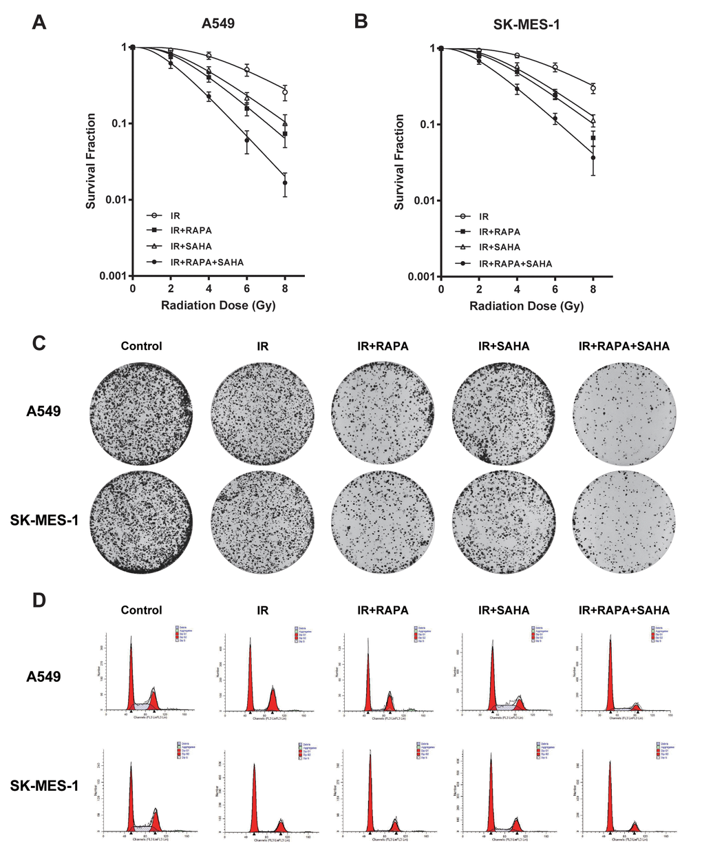 Our data showed that IR induced G2/M phase arrest in A549 and SK-MES-1 cells. G0/G1 phase arrest were induced by pre-treatment with RAPA before IR, and S phase arrest were induced by pre-treatment with SAHA. Combination treatment of RAPA and SAHA led to cell cycle arrest in the G0/G1 phase (Figure 2D).