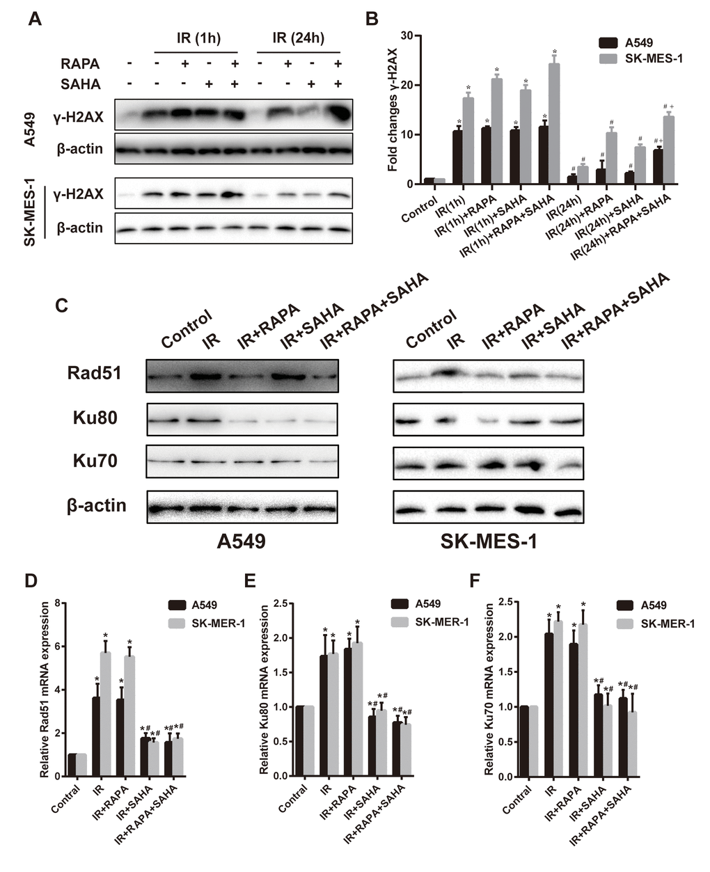 Cancer cells could repair DSB through HR and NHEJ repair pathways. DNA repair-related proteins, such as Rad51, Ku80, and Ku70, are essential players in the two pathways. Results showed that compared with the IR group, the combination treatment of RAPA and SAHA had been found obviously to downregulate DNA repair-related proteins, such as Rad51, Ku80, Ku70 in A549 cells, and Rad51, Ku70 in SK-MES-1 cells. Treatment with RAPA alone, Rad51 and Ku80 were decreased in both A549 and SK-MES-1 cells; or treatment with SAHA alone, Ku80 were decreased in A549 cell, and Rad51 were decreased in SK-MES-1 cells. (Figure 3C–3F).