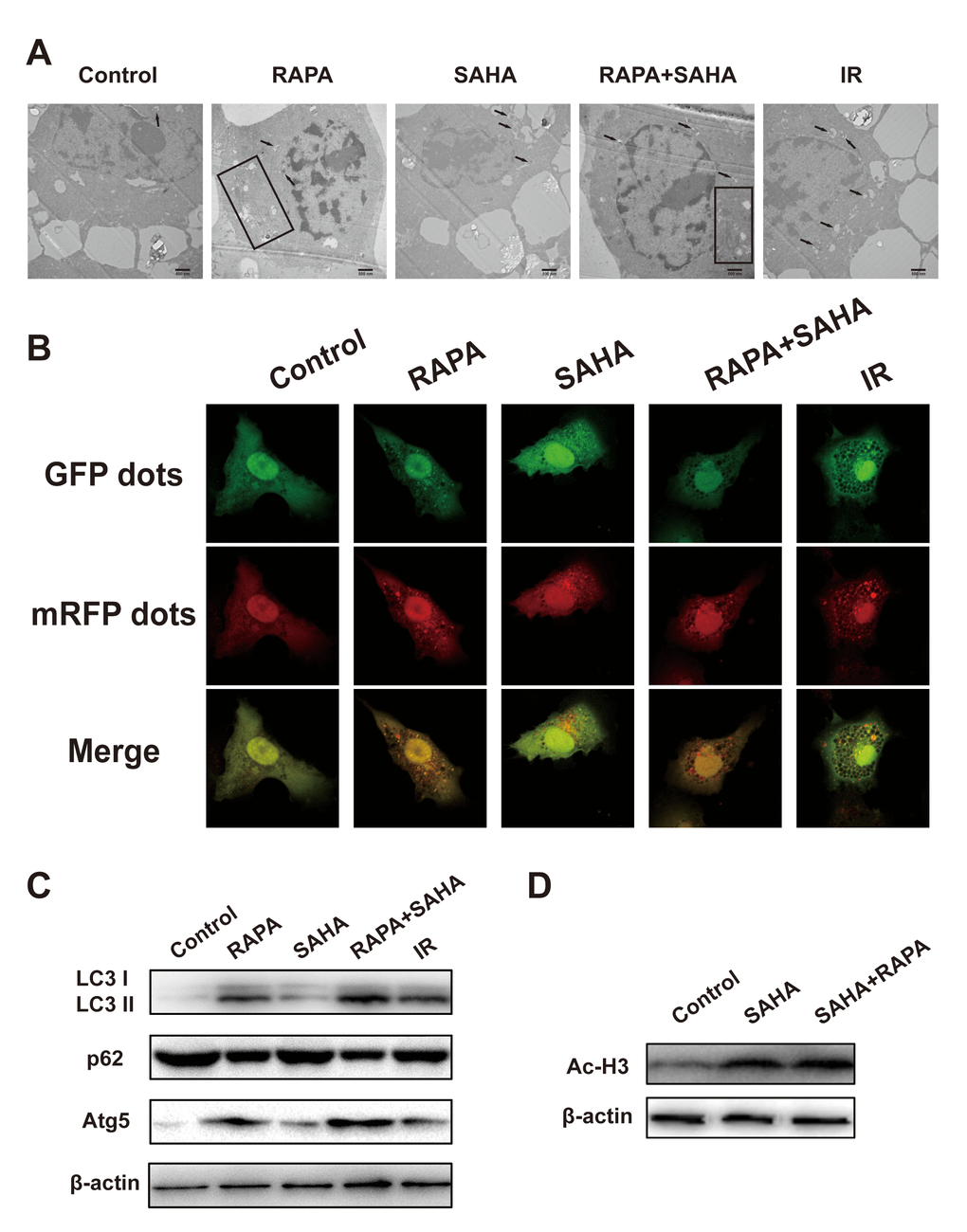 Our previous studies have demonstrated that RAPA induces autophagy sensitizes A549 cells to IR. To determine whether combined treatment can be induced autophagy and acetylation in A549 cells. Electron microscopy shows that IR, RAPA, SAHA, and combined treatment could induce the formation of autophagosomes in the cytoplasm of A549 cells (Figure 4A). Compared with other groups, combined treatment primarily increased the number of autophagosomes. We applied confocal immunofluorescence microscopy to detect the dots of LC3, which is widely used as a marker of autophagy in per A549 cells. By quantitative analysis, dots of LC3 were significantly increased in the cytoplasm of A549 cells after combined treatment compared with each of the different treatments (Figure 4B). LC3-II, Atg5, and p62 proteins are the most common autophagic-related markers. Our results revealed that combined treatment remarkably increased the expression of LC3-II and Atg5 proteins and marked decreased the expression of p62 proteins compared with RAPA, SAHA, or IR treatment alone (Figure 4C). The result indicated that both RAPA, SAHA, and IR could induce autophagy. The effect of RAPA is most significant.