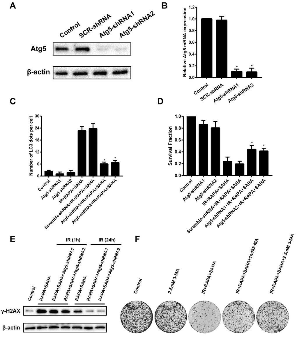 To confirm the function of autophagy in combined treatment-induced cytotoxicity after IR, A549 cells were transfected with Atg5 shRNA to induce Atg5 gene silencing then treated with RAPA and SAHA. Atg5 protein and mRNA expression were markedly decreased in A549 cells by transfected with Atg5-shRNA1 or Atg5-shRNA2 construct virus (Figure 5A, 5B). Besides, we found that the LC3 dots were remarkably decreased by transfected with Atg5-shRNA compared with the control shRNA (Figure 5C). This means that the effect of inducing autophagy by combined treatment of RAPA, SAHA, and IR will be attenuated by down-regulation of Atg5. Furthermore, inhibition of autophagy by transfected with Atg5-shRNA reduced the death of A549 cells after IR was treated with the combined treatment (Figure 5D). We have found that the combination treatment significantly enhanced the level of γ-H2AX after 24 hours of IR. The expression of γ-H2AX after 24 hours IR was markedly decreased by transfected with Atg5-shRNA (Figure 5E). We also used autophagy inhibitor 3-MA to inhibit the level of autophagy from testing the role of autophagy in radiotherapy. Our results showed that combined with 3-MA significantly reduces the efficacy of combined treatment of RAPA and SAHA for radiosensitization by clonogenic assays (Figure 5F). The results indicated that down-regulate autophagy conducive to DNA damage repair after IR, which led to reduce DNA damage and radiosensitization in cancer cells.