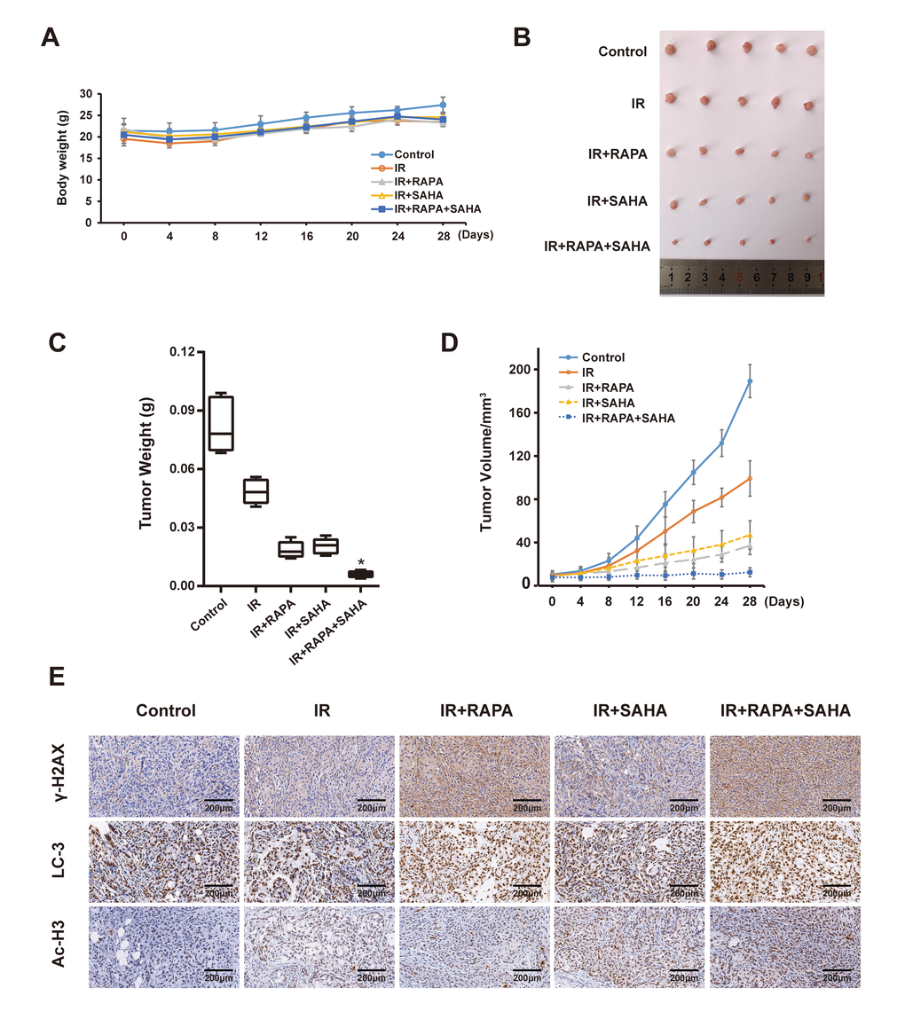 We next examined the anti-tumor effect of RAPA and SAHA either alone or in combination treatment in the A549 xenografts model after receiving IR in vivo. The body weight and tumor volume of the mice were measured every four days. Our results showed that the bodyweight of each group slightly decreased in the short term of treatment, then bodyweight gradually increased (Figure 6A). It indicated that each of the interventions does not produce toxic side effects based on the weight of mice. By measuring the tumor weight of each group after 28 days of intervention, we found that combined treatment of RAPA and SAHA dramatically inhibits the growth of the tumor compared with IR or other treatments (Figure 6B, 6C). We further measured the change of tumor volume every four days, the tumor volume in each group was gradually increased in a time-dependent manner, the inhibition effect of combined treatment on tumor volume was marked compared with other groups. Finally, we examined the expression of γ-H2AX, LC3, and Ac-H3 in the A549 tumor. The expression of γ-H2AX and LC3 were increased after IR compared with the control group. Tumor tissues from the combined treatment of RAPA and SAHA showed higher c-H2AX and LC3 than the tumor tissues from IR with RAPA or SAHA or IR alone. The expression of Ac-H3 in tumor tissues was increased in IR with SAHA and combined treatment. Results indicated that combined treatment of RAPA and SAHA significantly up-regulated autophagy and acetylation increased the DNA damage in A549 xenograft models.