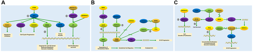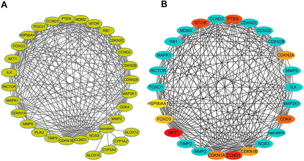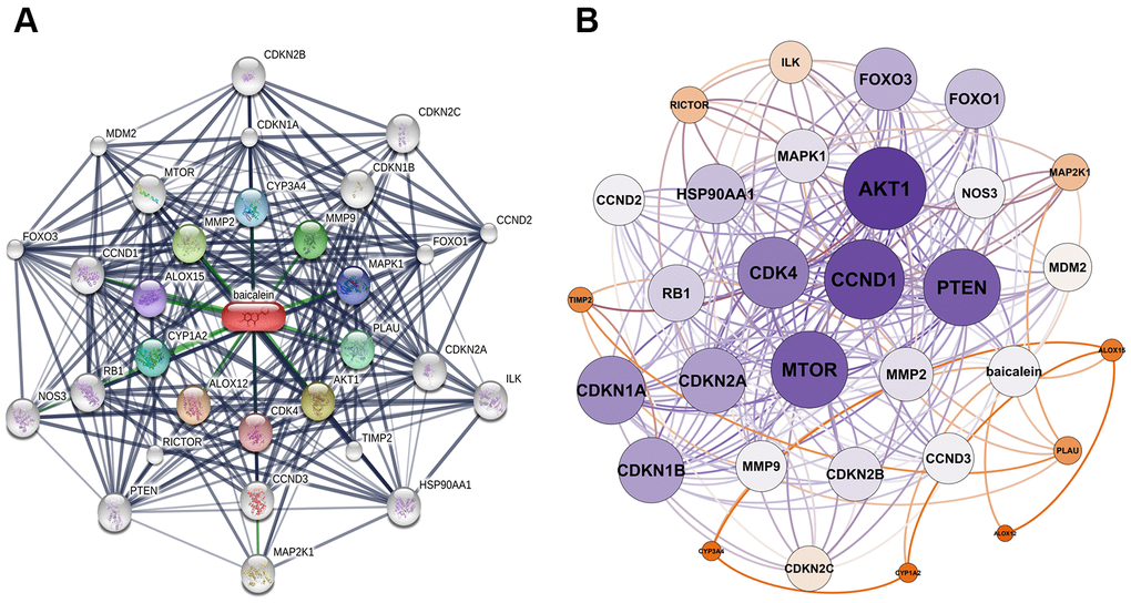We identified 30 baicalein-targeted genes belonging to three shells based on STITCH database analysis. The interaction network between these 30 baicalein-targeted genes is shown in Figure 1A. The first shell contained genes such as CYP1A2, CYP3A4, CDK4, MMP2, AKT1, MMP9, MAPK1, PLAU, ALOX12, and ALOX15 and were probably the direct targets of baicalein. The second shell included genes such as MTOR, RICTOR, TIMP2, RB1, CDKN1A, CDKN1B, CDKN2A, CCND3, FOXO1, and CCND1. The third shell included genes such as MAP2K1, NOS3, ILK, HSP90AA1, PTEN, FOXO3, MDM2, CDKN2C, CCND2, and CDKN2B. The network of baicalein-targeted genes based on interaction weights is shown in Figure 1B. AKT1, CCND1, MTOR, and PTEN showed the highest interaction weights among the 30 baicalein-targeted genes.