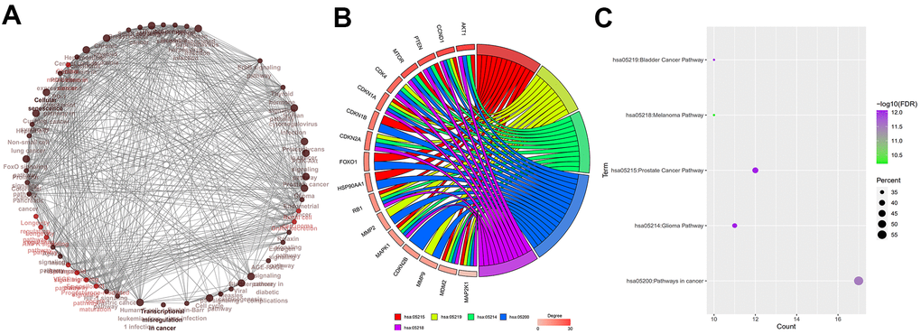 Functional enrichment analysis of BN-targeted genes is shown in Figure 4A. Among the 30 BN-targeted genes, AKT1, CCND1, PTEN, MTOR, CDK4, CDKN1A, CDKN1B, CDKN2A, FOXO1, HSP90AA1, RB1, MMP2, MAPK1, CDKN2B, MMP9, MDM2, and MAP2K1 were involved in the top five KEGG pathways. Furthermore, we identified CCND1, CDKN1A, RB1, MAPK1, MDM2, and MAP2K1 were identified as hub genes (Figure 4B). The FDR values, gene counts, and rich factors are shown in Figure 4C. The KEGG pathway, hsa05200: pathways in cancer, showed the highest FDR value, rich factor, and gene numbers (Figure 4C).