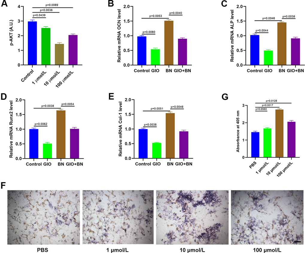 We then analyzed AKT phosphorylation levels in MC3T3-E1 cells treated with different concentrations of baicalein (1 μM, 10 μM, and 100 μM) by ELISA. BN treatment significantly reduced p-AKT levels in MC3T3-E1 cells; p-AKT levels were significantly lower in the 10 μM BN-treatment group compared to the 1 μM and 100 μM BN-treatment groups (Figure 6A). QRT-PCR analysis results showed that the GIO treatment significantly decreased the expression levels of bone turnover markers such as ALP, OCN, Runx2, and Col 1 in MC3T3-E1 cells, but these effects were partially reversed by BN (Figure 6B–6E). Furthermore, ALP staining assay results showed that BN partially rescued impaired extracellular matrix mineralization in GIO-treated MC3T3-E1 cells (Figure 6F, 6G).