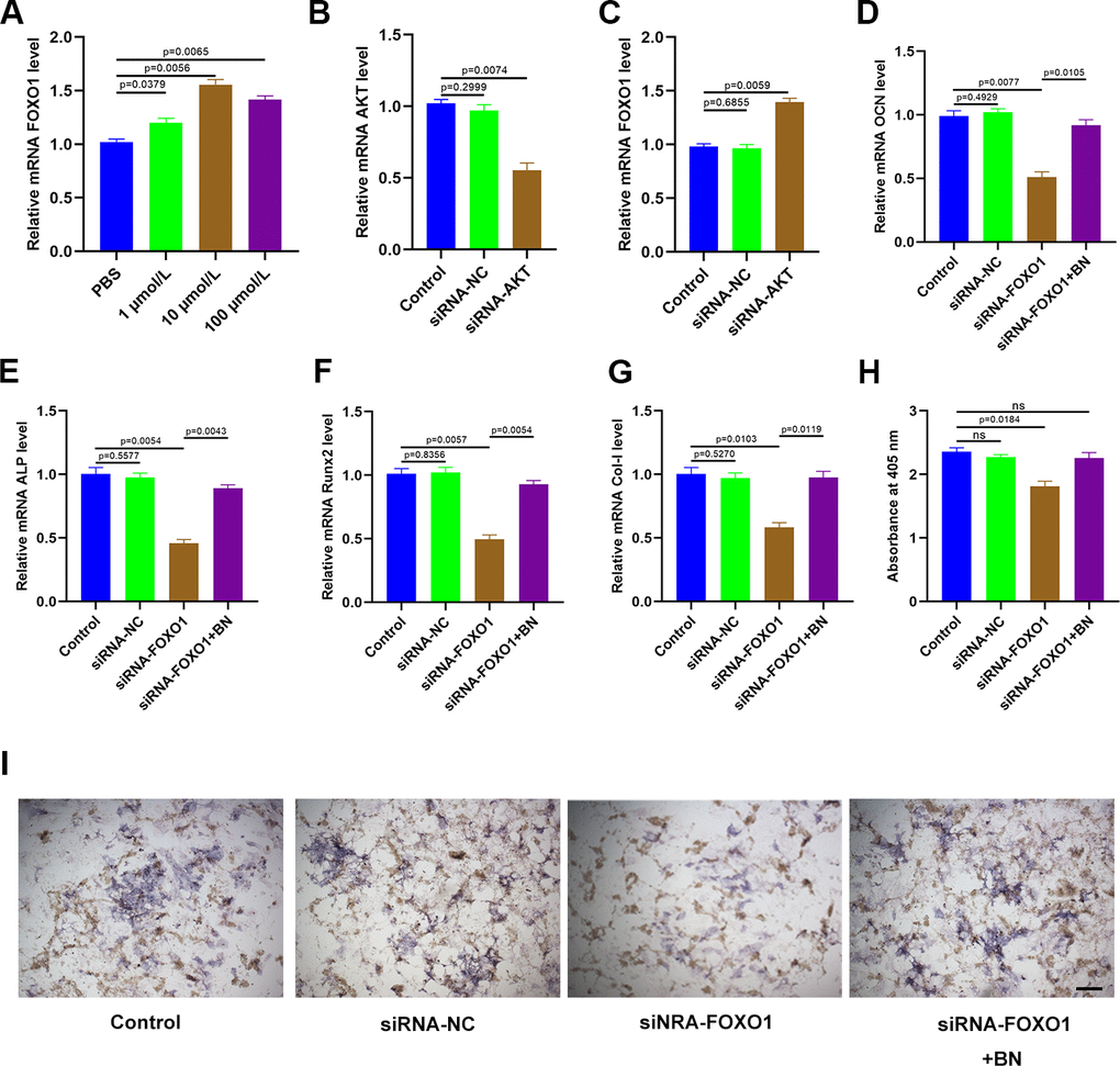 QRT-PCR analysis showed that expression of FOXO1 was significantly increased in BN-treated MC3T3-E1 cells; FOXO1 levels were highest in the 10 μM BN-treatment group (Figure 7A). Furthermore, qRT-PCR analysis confirmed that AKT levels were significantly reduced in AKT-siRNA-transfected MC3T3-E1 cells compared to the corresponding controls (Figure 7B). AKT silencing significantly increased FOXO1 levels in MC3T3-E1 cells (Figure 7C). QRT-PCR analysis showed that FOXO1 silencing significantly reduced expression levels of the bone turnover markers (ALP, OCN, Runx2, and Col 1) in GIO-treated MC3T3-E1 cells, but these effects were partially reversed by BN treatment (Figure 7D–7G). ALP staining results showed that BN treatment partially rescued impaired extracellular matrix mineralization in GIO-treated FOXO1-silenced MC3T3-E1 cells (Figure 7H, 7I).