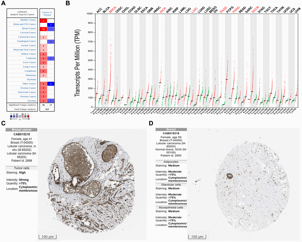 The HPA database is a Swedish project to map all human proteins in cells, tissues and organs by integrating data from TCGA, HPA datasets, the GTEx consortium and recount2. We used the HPA database to assess ATP6AP1 protein levels in tumors and adjacent normal tissues. The antibody used to obtain the immunohistochemistry results was CAB015218 (Origene) at a dilution of 1:30. The immunohistochemistry results and antibody information are shown in Figure 1; however, due to the number of specimens in the database, we selected only a representative group for the figure, and placed the rest in the Supplementary Material.