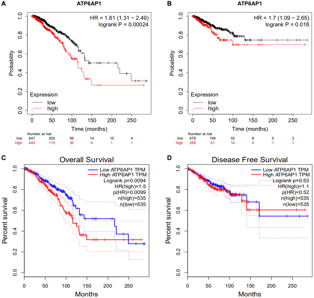 To determine the relationship between ATP6AP1 expression and BC prognosis, we used the Kaplan-Meier Plotter to determine the overall survival (OS) and relapse-free survival (RFS) or disease-free survival (DFS) of BC patients who were separated into two groups (high and low) based on the median ATP6AP1 level. As shown in Figure 2A and 2B, higher ATP6AP1 expression was associated with a poorer BC prognosis (OS hazard ratio = 1.81, log-rank P = 0.00024; RFS hazard ratio = 1.7, log-rank P = 0.018). Data from TCGA in GEPIA confirmed that higher ATP6AP1 expression was associated with a significantly poorer prognosis in BC patients (all P < 0.05; Figure 2C and 2D).