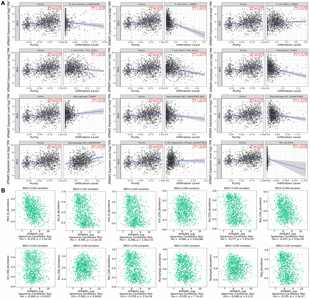 Correlation of ATP6AP1 levels with tumor-infiltrating immune cell (TIIC) and immune cell marker levels in BC