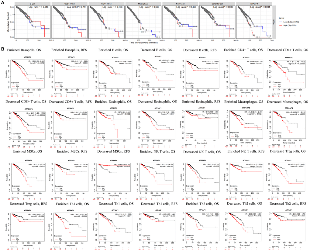 Since higher ATP6AP1 expression was associated with a poorer prognosis in BC patients, we used the TIMER to determine whether this association depended on the abundance of immune infiltrates in BC tissues (Figure 4A). ATP6AP1 expression-based clinical outcomes correlated significantly with B cell levels (log-rank P = 0.046). We then used Kaplan-Meier Plotter to assess the relationship between ATP6AP1 levels and clinical outcomes after stratifying patients according to the levels of other types of TIICs (Figure 4B). BC patients with higher ATP6AP1 levels had poorer prognoses, whether they had enriched or reduced levels of B cells, CD4+ T cells, eosinophils, macrophages, mesenchymal stem cells, natural killer T cells, Th1 cells or Th2 cells (all P < 0.05). On the other hand, BC patients with higher ATP6AP1 levels had poorer prognoses if they had enriched basophil levels, reduced CD8+ T cell levels or reduced Treg levels (all P < 0.05), but not if they had reduced basophil levels, enriched CD8+ T cell levels or enriched Treg levels. Thus, immune infiltration may partly explain the poorer prognoses of BC patients with higher ATP6AP1 levels.