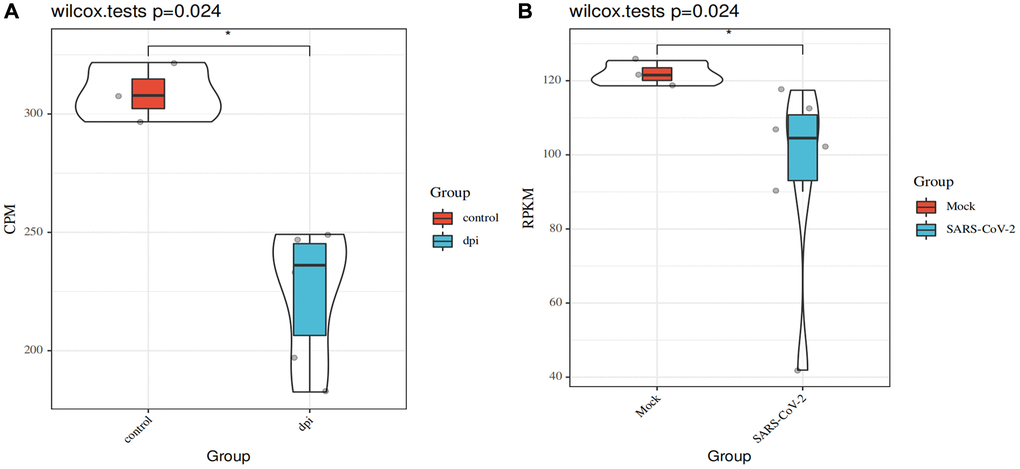 GEO is a common functional genomics data repository. We analyzed expression profiles from GSE153277 [40] and GSE155241 [41]. GSE153277 contains nine samples from iAT2 cells infected with SARS-CoV-2 or a mock virus. GSE155241 contains data from hPSC-LO cells cultured with SARS-CoV-2 or a mock virus. Nine samples were selected from a total of 18. The GPL18573 Illumina NextSeq 500 (Homo sapiens) and GPL24676 Illumina NovaSeq 6000 (Homo sapiens) platforms were used to sequence the respective datasets. ATP6AP1 levels were compared between the control and SARS-CoV-2 groups using the Sangerbox tool, a free online platform for data analysis (http://www.sangerbox.com/tool).