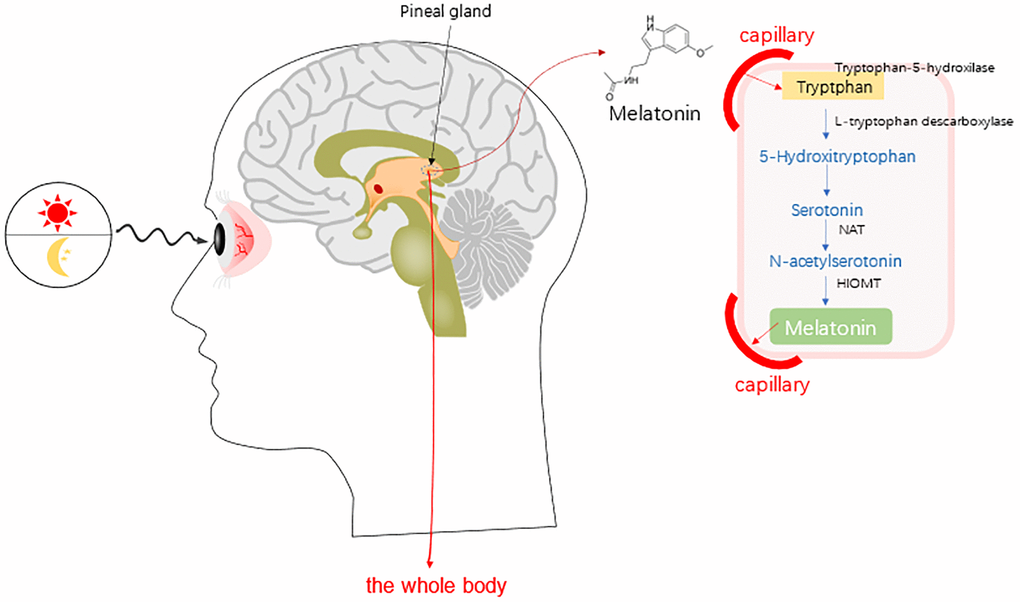 The synthesis and secretion of MT is regulated by the endogenous circadian clock in the suprachiasmatic nucleus. The levels of MT synthesis and secretion are high at night, while relatively low levels would be observed during the day, with roughly sinusoidal rhythm. The MT secretion presents a circadian rhythm of low during day and high at night, which is the basis for the physiological function of basis circadian rhythm [13].
