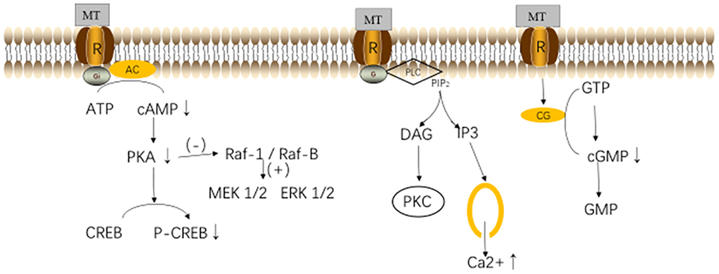The MT receptors could be divided into the membrane and nuclear receptors, respectively [17]. The latter is mainly related to the RZR/ROR superfamily of nuclear receptors. There are three subtypes of membrane receptors, i.e., the MT1, MT2 and MT3 receptors [17]. However, only the MT1 and MT2 receptor subtypes exist in humans and other mammals, which are encoded by the MTNR1A gene of q35·1 on chromosome 4 and the MTNR1B gene of q21-q22 on chromosome 11, respectively [18]. Based on the molecular structure, the MT1 receptor is composed of 350 amino acids, while the MT2 receptor is composed of 363 amino acids. These two receptors share 60% sequence homology, both belonging to the 7-transmembrane G protein-coupled receptor family, with similar binding site structure for MT [19].