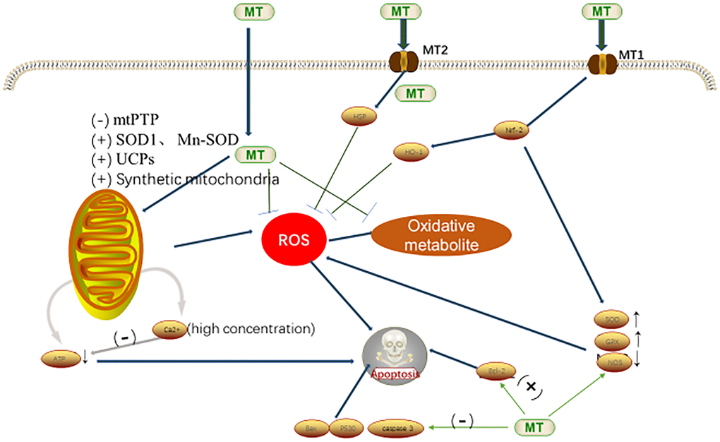 Mitochondria are dynamic and plastic organelles that produce ATP through oxidative phosphorylation, which is key to connecting the oxidative stress and energy metabolism. MT can maintain the mitochondrial functions through the following ways: (1) by inhibiting the opening of mitochondrial permeability transition pore (mtPTP), stimulating the expression and activity of SOD1 and Mn-SOD (SOD2) in the mitochondrial matrix, regulating the mitochondrion electron flux, and reducing the mitochondrial electron leakage; (2) by increasing the activity of uncoupling proteins (UCPs), reducing the ATP production, and inhibiting the ROS production; and (3) by promoting the mitochondrial biosynthesis, and protecting the mitochondrial morphology and function [49].