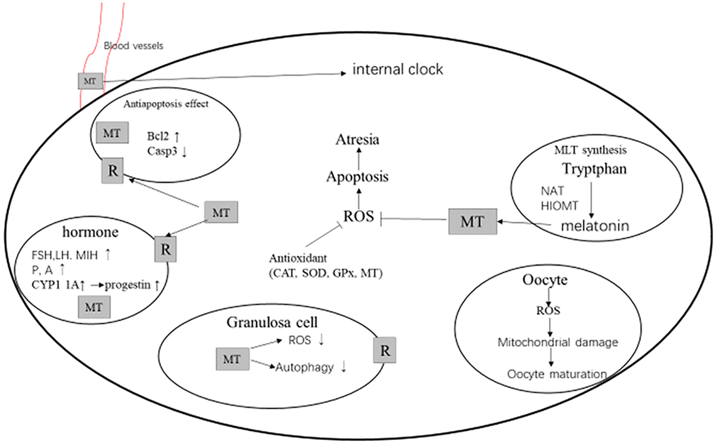 MT increases the synthesis of glutathione in human endothelial cells, and prevents the induction of mitochondrial endogenous apoptosis pathways by inducing the Bcl-2 expression and reducing the caspase-3 activity [11]. Therefore, MT protects cells from oxidative stress due to radical damages. The administration of exogenous MT can significantly reduce the oxidative damages in the follicle and the oxidative damages of essential molecules, thereby increasing the fertilization rate and pregnancy rate [11, 14]. MT regulates the responses of follicles to LH by increasing the mRNA expression levels of LH receptors in human granulosa cells [60]. In addition, MT-induced progesterone production would be produced by inhibiting CYP1 1A. CYP1 1A is a specific gene for progesterone synthesis, which increases its secretion through negative feedback, which is necessary for follicular maturation and ovulation during the dominant follicular phase [61].