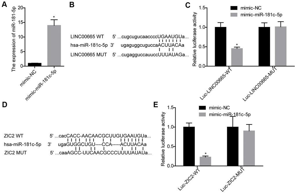 Next, we carried out luciferase gene reporter assay to verify the relationship between LINC00665 and miR-181c-5p, and miR-181c-5p and ZIC2. The expression of miR-181c-5p was significantly increased when SK-LU-1 cells were infected with mimic-miR-181c-5p (Figure 3A). We then constructed the WT and MUT luciferase reporter vectors of LINC00665, and the sequences were shown in Figure 3B. The luciferase activity was decreased when miR-181c-5p was upregulated in SK-LU-1 cells, whereas mutations of the binding sites abolished this effect (Figure 3C). Also, miR-181c-5p upregulation significantly reduced the luciferase activity of luc-ZIC2-WT vector, and mutations of the binding sites abolished it (Figure 3D, 3E). These results demonstrated that LINC00665 could target miR-181c-5p/ZIC2 axis.