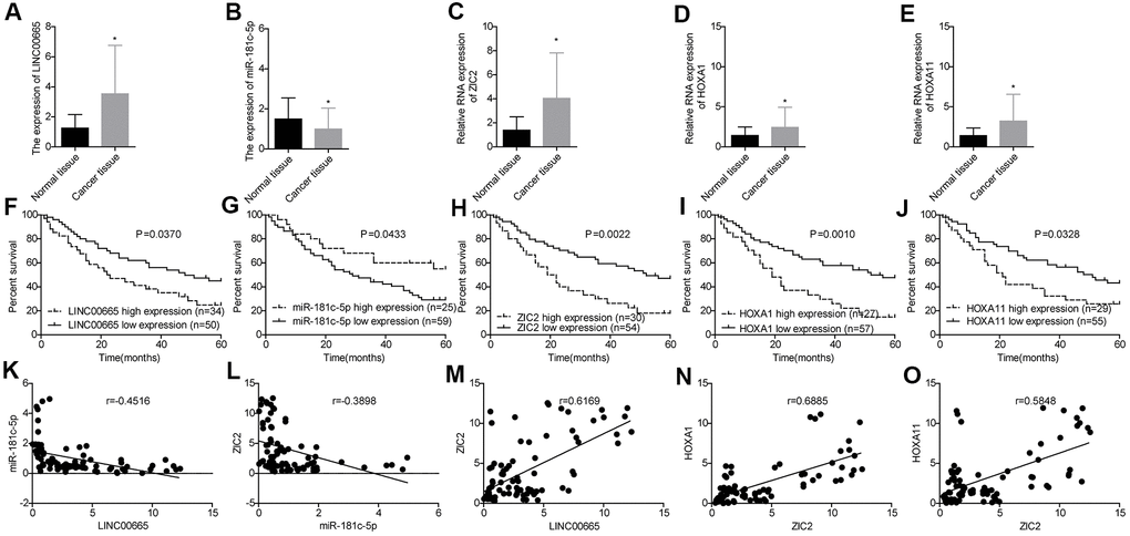 Next, we used RT-PCR assay to further assess the expression profiles of LINC00665, miR-181c-5p, ZIC2, HOXA1 and HOXA11 in 84 paired LUAD tissues and the paracancerous normal tissues. LINC00665 (Figure 4A), ZIC2 (Figure 4C), HOXA1 (Figure 4D) and HOXA11 (Figure 4E) levels were elevated in LUAD tissues, while miR-181c-5p expression was decreased (Figure 4B). High expression levels of LINC00665, ZIC2, HOXA1 and HOXA11 and low expression level of miR-181c-5p were closely associated with the shorter overall survivals in LUAD patients (Figure 4F–4J). Moreover, Pearson correlation analysis showed that miR-181c-5p expression was negatively correlated with LINC00665 and ZIC2 expression levels in LUAD tissues (Figure 4K, 4L), and ZIC2 expression level showed positive correlations with LINC00665, HOXA1 and HOXA11 expressions (Figure 4M–4O). These results confirmed that LINC00665, ZIC2, HOXA1 and HOXA11 were overexpressed, and miR-181c-5p was downregulated in LUAD.