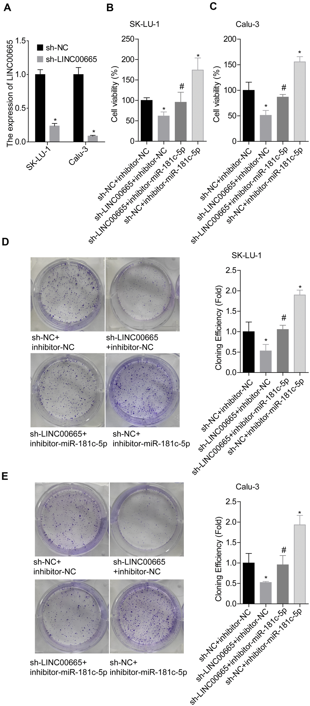 To establish the stable transfection cells, SK-LU-1 and Calu-3 cells were infected with sh-LINC00665, sh-ZIC2, inhibitor-miR-181c-5p, mimic-miR-181c-5p, control vector or two of them with the help of polybrene (7 μg/ml), followed by incubation with 5 μg/ml puromycin or/and 100 μg/ml G418.