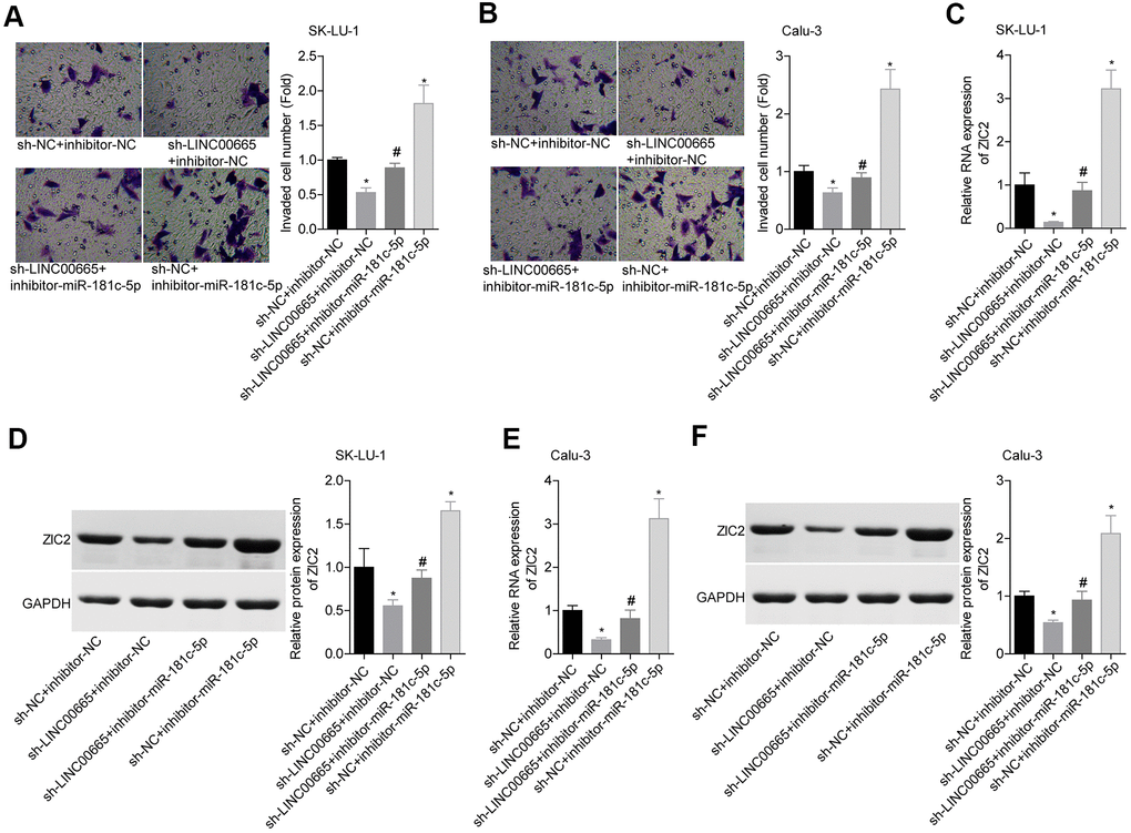 We then elucidated the effects of LINC00665/miR-181c-5p on the progression of LUAD in vitro. The expression of LINC00665 was apparently reduced when sh-LINC00665 was stably introduced to SK-LU-1 and Calu-3 cells (Figure 5A). Cell viability (Figure 5B, 5C), clone formation (Figure 5D, 5E) and invasion (Figure 6A, 6B) abilities were significantly weakened when -LINC00665 was downregulated in SK-LU-1 and Calu-3 cells, while inhibitor-miR-181c-5p caused the opposite results and reversed the above tendencies induced by sh-LINC00625 (Figures 5B–5E, 6A, 6B). In addition, knockdown of LINC0000665 significantly reduced ZIC2 expression (Figure 6C–6F), whereas this potency was abolished when miR-181c-5p was downregulated in SK-LU-1 and Calu-3 cells. These findings suggested that downregulation of LINC00665 repressed cell growth and invasion, and reduced ZIC2 expression in LUAD through targeting miR-181c-5p.