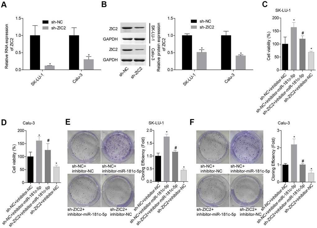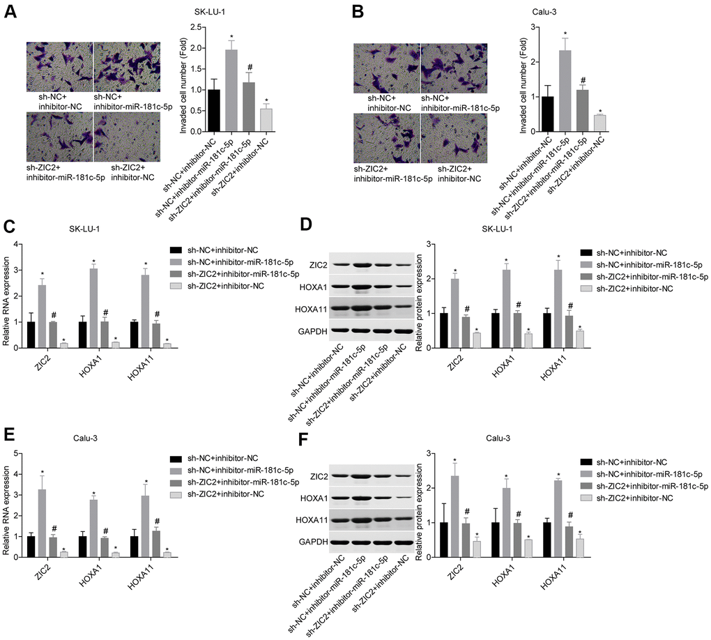 Next, we assessed miR-181c-5p/ZIC2 role in LUAD progression in vitro. The expression of ZIC2 was apparently decreased when SK-LU-1 and Calu-3 cells were stably transfected with sh-ZIC2 at mRNA (Figure 7A) and protein (Figure 7B) levels. Inhibitor-miR-181c-5p stable transfection significantly enhanced cell viability (Figure 7C, 7D), clone formation (Figure 7E, 7F) and invasion (Figure 8A, 8B), whereas ZIC2 downregulation obviously rescued these tendencies and induced opposite results (Figures 7A–7D, 8A, 8B). In addition, downregulation of miR-181c-5p induced significant increases in the expressions of HOXA1 and HOXA11, whereas this effect was abrogated when ZIC2 was silenced in both SK-LU-1 and Calu-3 cell lines (Figure 8C–8F). These results indicated that miR-181c-5p downregulation promoted LUAD cell growth and invasion by regulating ZIC2 expression.