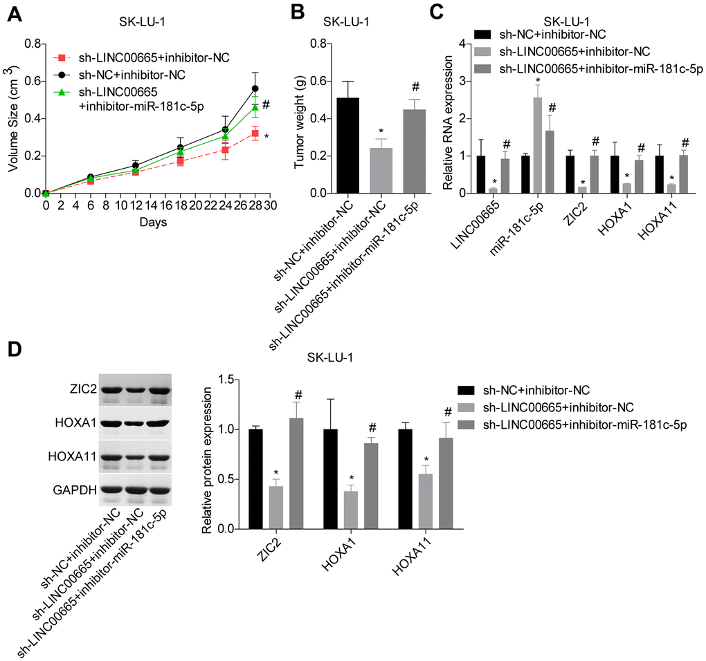 At the end, we carried out the in vivo tumor-burdened experiment to reveal the role of LINC00665/miR-181c-5p/ZIC2 axis in the progression of LUAD. Tumor weights were significantly reduced when LINC00665 was downregulated in SK-LU-1 cells, whereas it was obviously neutralized by inhibitor-miR-181c-5p (Figure 9A, 9B). We then assessed the expressions of ZIC2, HOXA1 and HOXA11 in mice tumors derived from different groups. LINC00665 downregulation obviously reduced the expressions of ZIC2, HOXA1 and HOXA11, whereas inhibitor-miR-181c-5p reversed this effect (Figure 9C, 9D). These results further demonstrated that knockdown of LINC00665 suppressed in vivo tumor formation via targeting miR-181c-5p/ZIC2 in LUAD.
