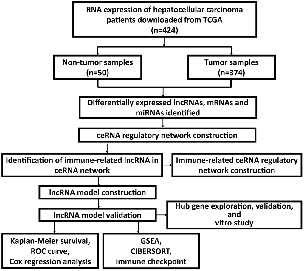 It is therefore important to carry out a comprehensive analysis of the HCC ceRNA network in aspect of the regulatory functions. The obtained public databases have been widely used to build a lncRNA-miRNA-mRNA ceRNA regulatory network and to mine potential prognostic biomarkers in several types of cancers, such as cholangiocarcinoma, gastric carcinoma, colon adenocarcinoma (CA) and HCC [5, 7]. The established networks are conducive to understand complex interactions of lncRNAs, miRNAs and mRNAs. And the identification of more accurate markers based on the ceRNA network may also contribute to the early diagnosis of cancer, the effectiveness of treatment, and the prognosis of patients. However, there is a lack of studies on the ceRNA network in HCC from the immune regulation viewpoint. Exploring specific ceRNA networks associated with immune regulation might facilitate to understand the tumor-immune interactions, which has great prospects in the therapeutic interventions of HCC. Based on the accumulating evidence, it is shown that ceRNA-related genes do greatly work in the occurrence, development and prognosis of most cancer types [8]. Thus, ceRNA-and-immune-related lncRNAs may also potentially become diagnostic biomarkers or treated targets for HCC. In addition, there is still no study on the construction of prognostic model of HCC by using immune-related lncRNAs from the ceRNA network.