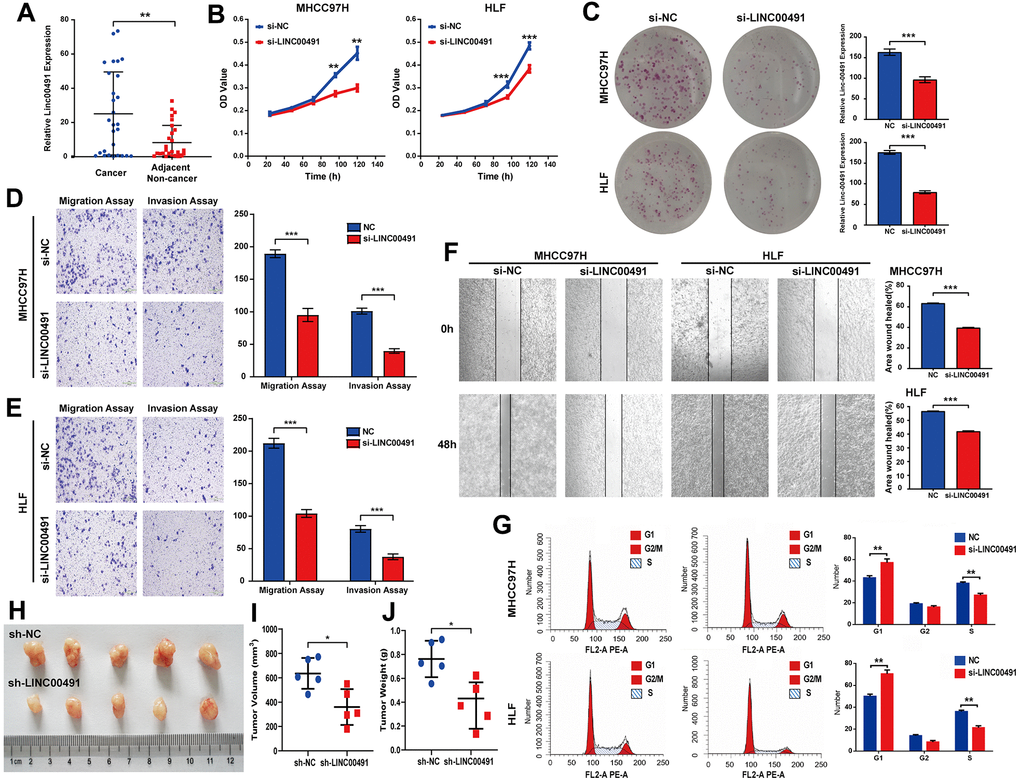 LINC00491 was overexpressed in cancerous tissues by qRT-PCR in Zhujiang cohorts, which was consistent with the above database results (Figure 10A). To illuminate the proliferative rate after LINC00491 knockdown in HCC cells, Cell Counting Kit-8 (CCK-8) assays in MHCC-97H and HLF cell lines both showed lower absorbance at 96h and 120h, respectively (Figure 10B). After silencing of LINC00491, the Colony formation assay indicated that the growth of HCC cells was significantly suppressed after silencing of LINC00491 (Figure 10C), transwell assay results showed that the invasion and migration rates of HCC cells were significantly suppressed (Figure 10D, 10E), and wound healing in HCC cells were also significantly inhibited (Figure 10F). Cell cycle progression in MHCC97H and HLF cells revealed that LINC00491 depletion significantly repressed cell cycle progression (Figure 10G). In vivo experiments with subcutaneous tumor models were shown in Figure 10H. In accord with in vitro observations, tumor volume and tumor weight were both significantly decreased after knockdown of LINC00491 (Figure 10I, 10J).
