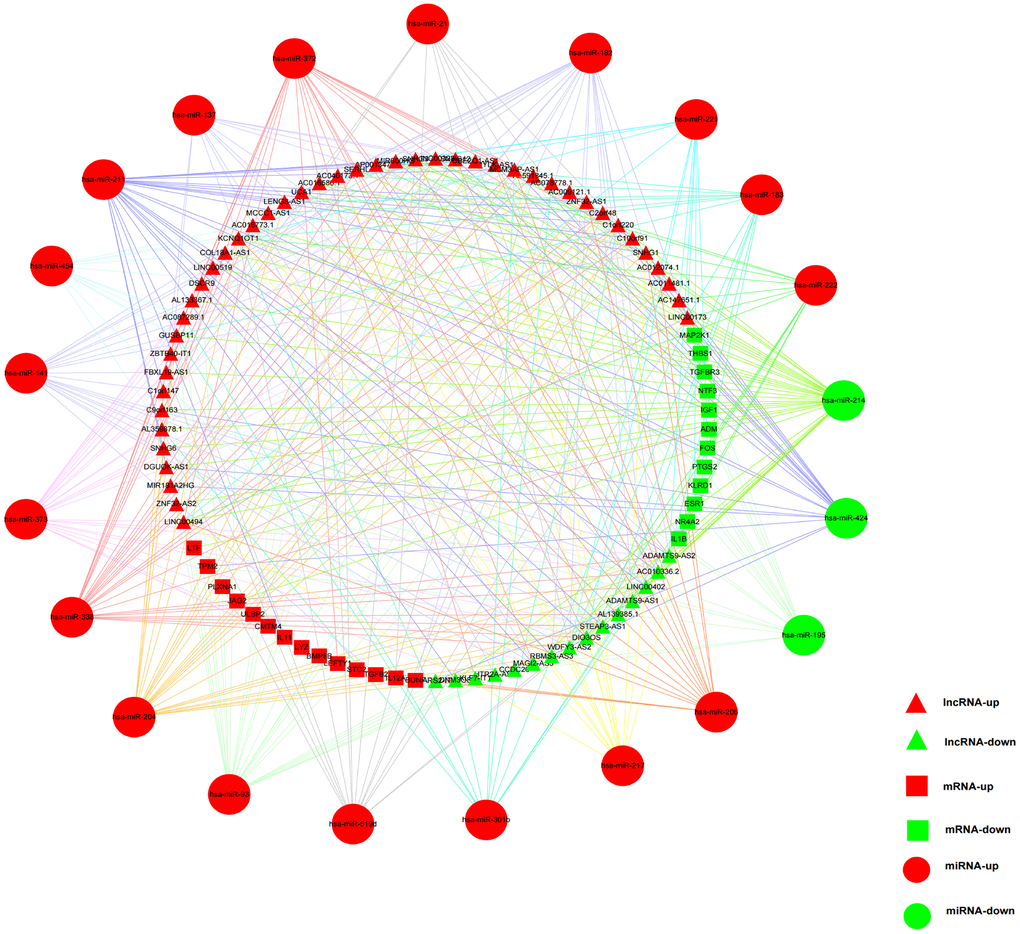 The miRcode database was used to predict the relationship between DElncRNAs and DEmiRNAs. The miRDB, miRTarBase, and TargetScan databases were applied to retrieve the target DEmRNAs of DEmiRNAs. Cytoscape software was used to visualize the ceRNA network.