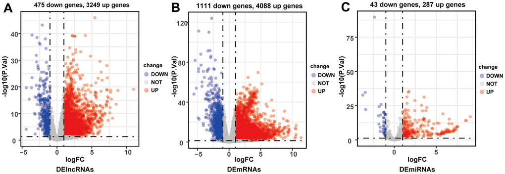 By comparing HCC and adjacent normal liver tissues in TCGA-LIHC database (p < 0.05, |log2-fold change (FC)| > 1), a total of 3724 DElncRNAs (3249 upregulated and 475 downregulated), 5199 DEmRNAs (4088 upregulated and 1111 downregulated), and 330 DEmiRNAs (287 upregulated and 43 downregulated) were identified (Figure 2A–2C).