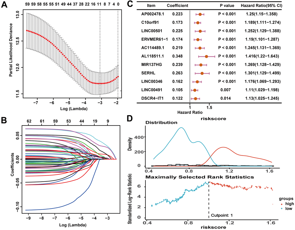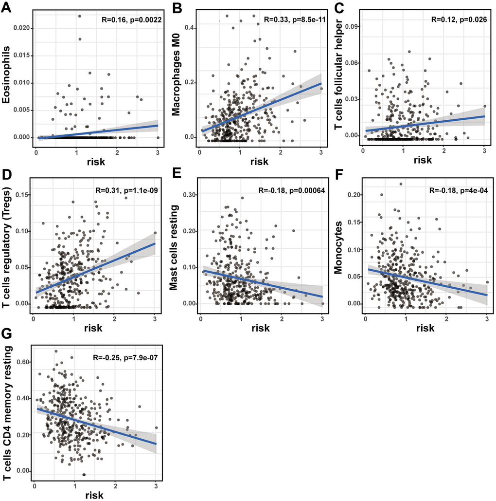 The prognostic lncRNA signature was significantly positively correlated with immune infiltration of eosinophils (R = 0.16; p = 0.0022), M0 macrophage (R = 0.33; p < 0.001), follicular helper T cells (R = 0.12; p = 0.026), and regulatory T cells (R = 0.31; p < 0.001). And the signature was also significantly negatively correlated with immune infiltration of resting mast cell (R = -0.18; p < 0.001), monocytes (R = -0.18; p < 0.001), and CD4 memory resting T cells (R = -0.25; p < 0.001) (Figure 7A–7G). The high correlation between the signature and immune cell infiltration strongly manifested that the signature was consistent with the immunologic signature analysis.
