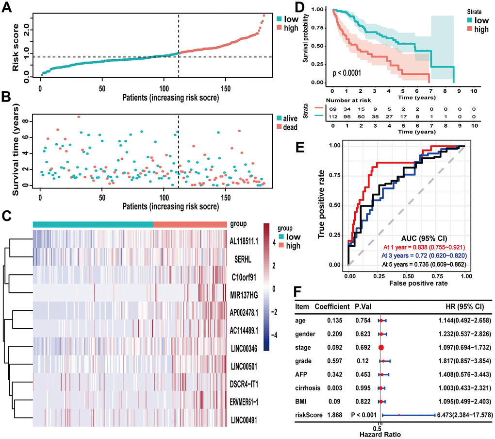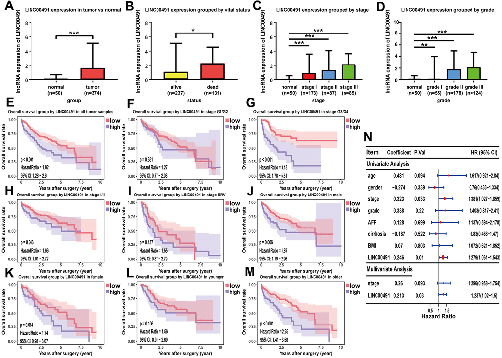 As shown in the boxplot, LINC00491 expression level was significantly upregulated in the HCC tissues, and LINC00491 also significantly differentially expressed in different groups of varying vital status (Figure 9A, 9B). Interestingly, LINC00491 level had the ability to distinguish noncancerous tissues from HCC tissues at AJCC stage I, II, III, and IV (Figure 9C). And LINC00491 could also be applied to distinguish normal tissues from tumor tissues at different histologic grades (Figure 9D). To explore the prognostic ability of LIHC00491, survival analysis found that HCC patients with higher LINC00491 expression level demonstrated a poorer OS (Figure 9E). Subgroup results showed that patients with higher LINC00491 expression level in histologic stage G3/G4, AJCC stage I/II, male and old-age (age ≥ 60) had shorter OS (Figure 9F–9M). Following the multivariate Cox analysis result, LINC00491 expression level could act as an independent prognostic indicator of OS in HCC patients (Figure 9N). Furthermore, LINC00491 was also positively correlated with the above mentioned 11 ICBs (Supplementary Figure 4).